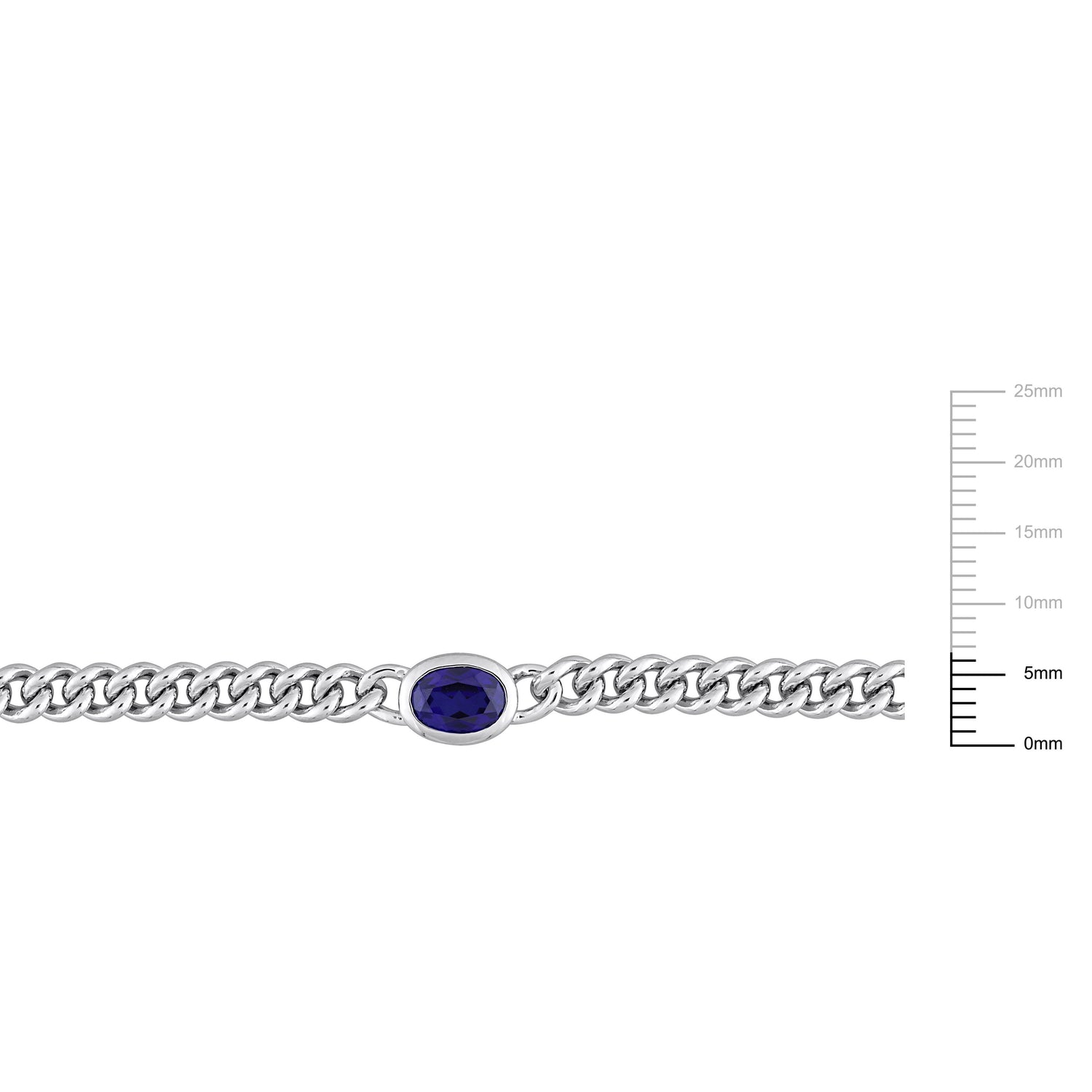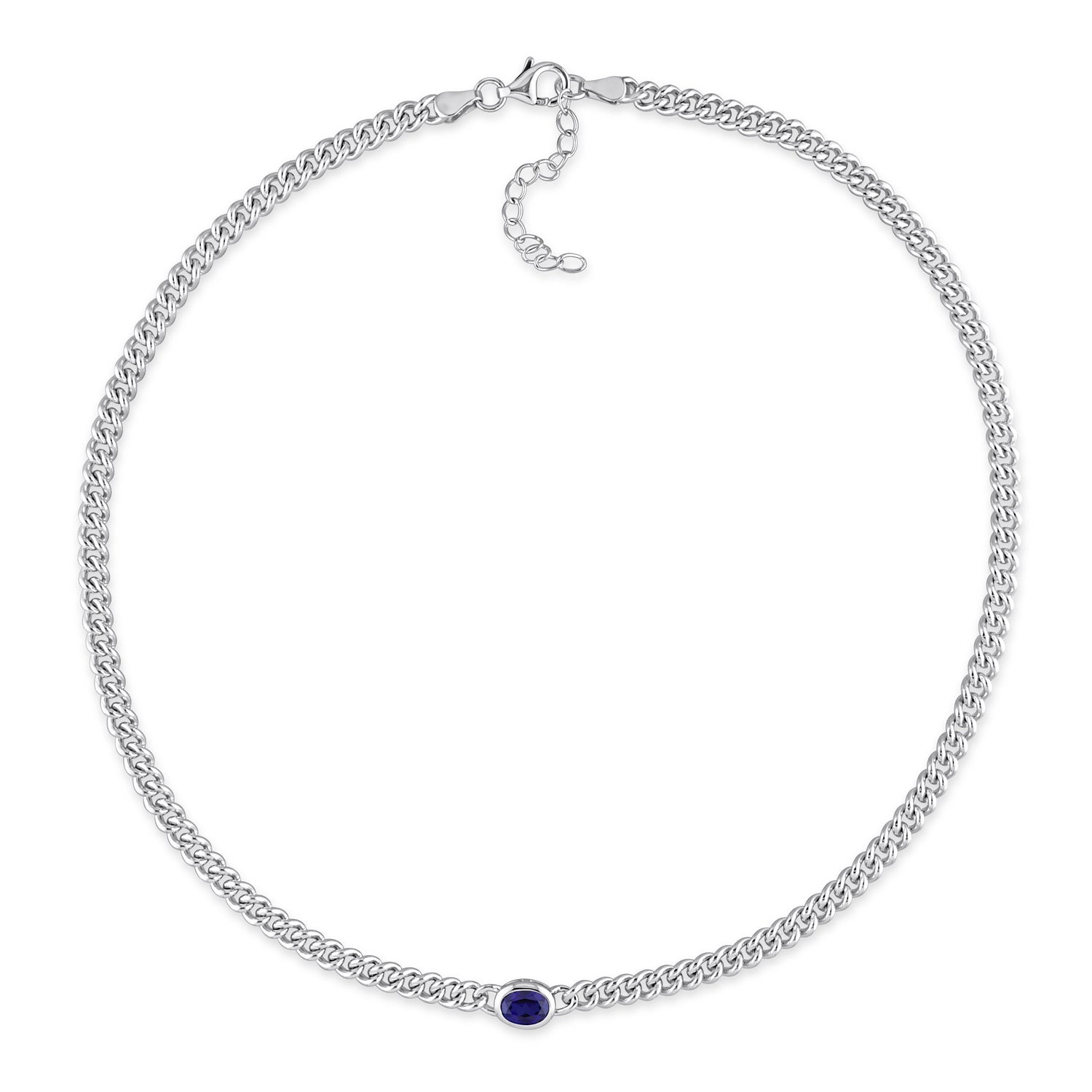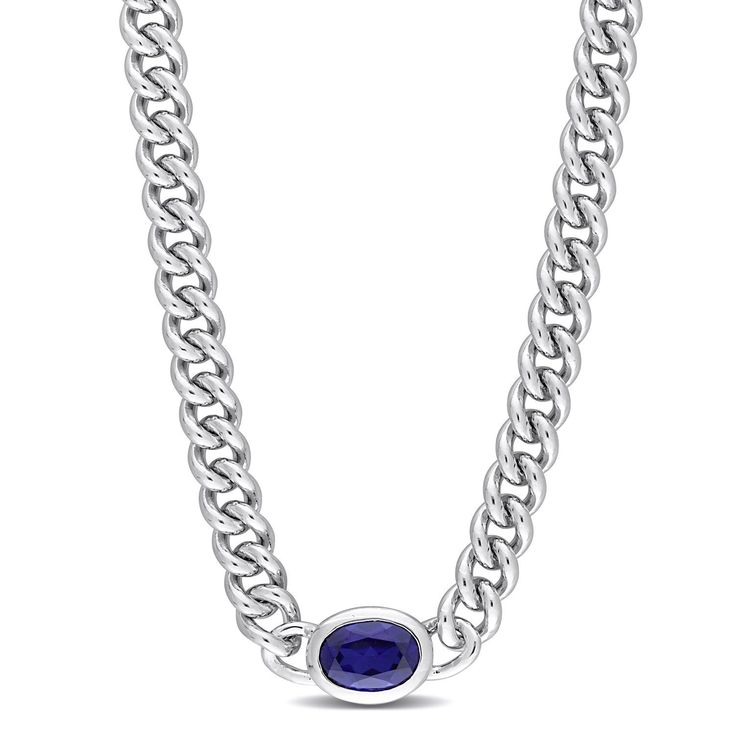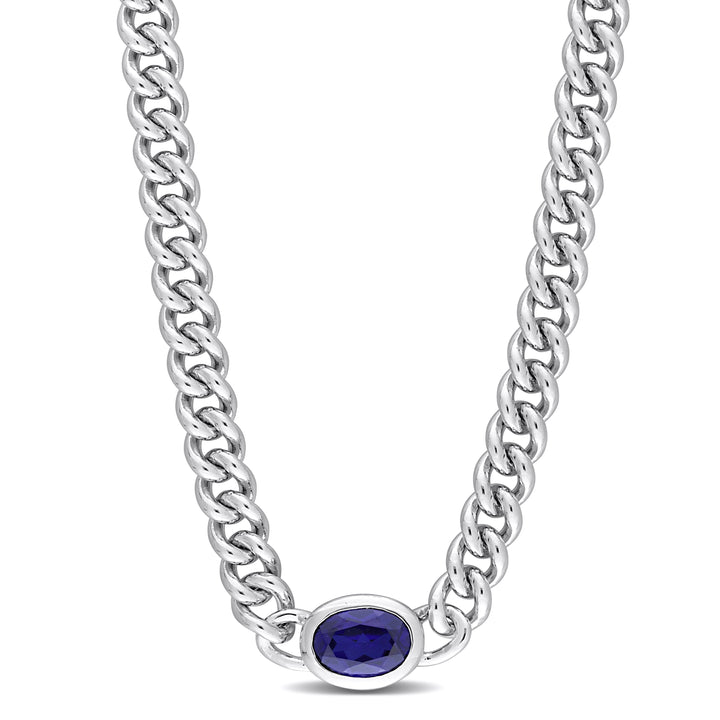 Crafted in sterling silver with a 1 1/4ct total gemstone weight. Features a 7x5mm oval-cut created blue sapphire and a flat curb chain measuring 16 inches in length with a lobster clasp.