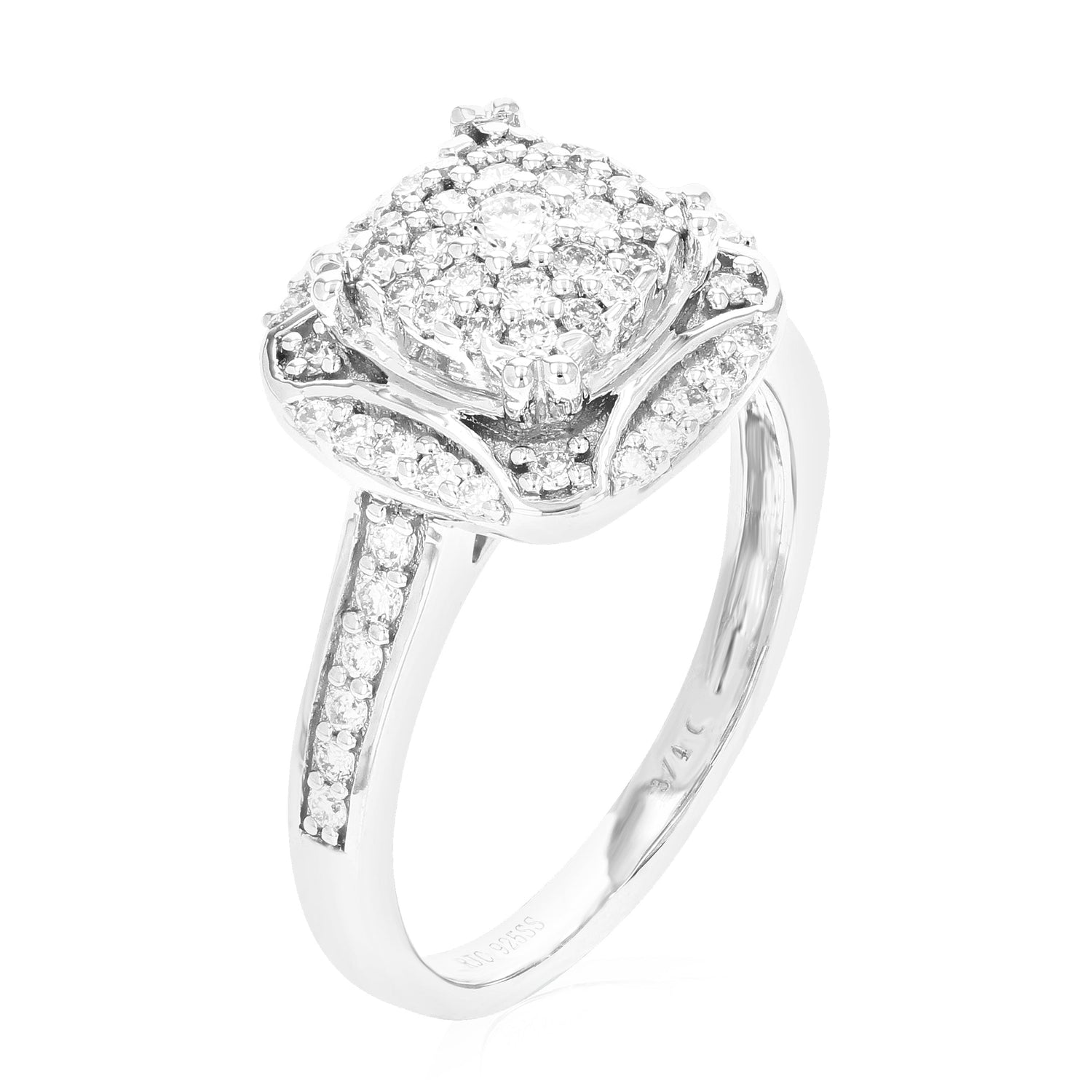 Crafted in .925 sterling silver with 3/4 cttw round-cut lab-grown diamonds. Diamonds are H-I color, SI1-SI2 clarity. Features a prong setting with 85 diamonds. Ring dimensions: Width: 12mm (1/2 inch), Length: 21mm (3/4 inch).