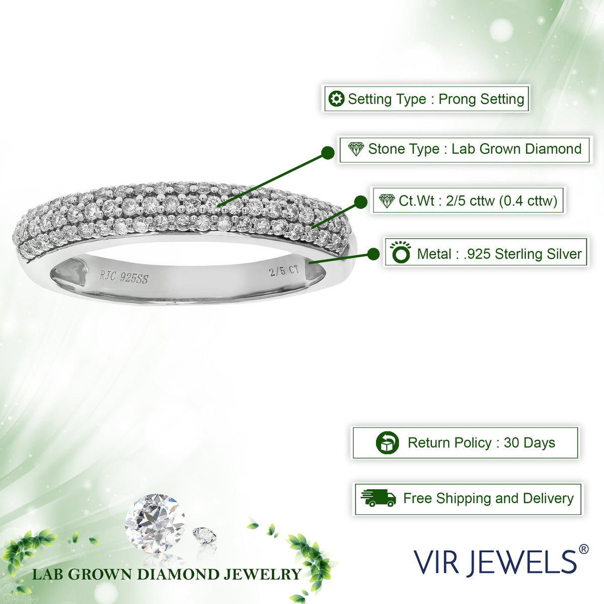 Crafted in .925 sterling silver with 2/5 cttw round lab-grown diamonds. Diamond clarity: SI1-SI2, color: H-I. Prong setting. Band width: 3 MM.