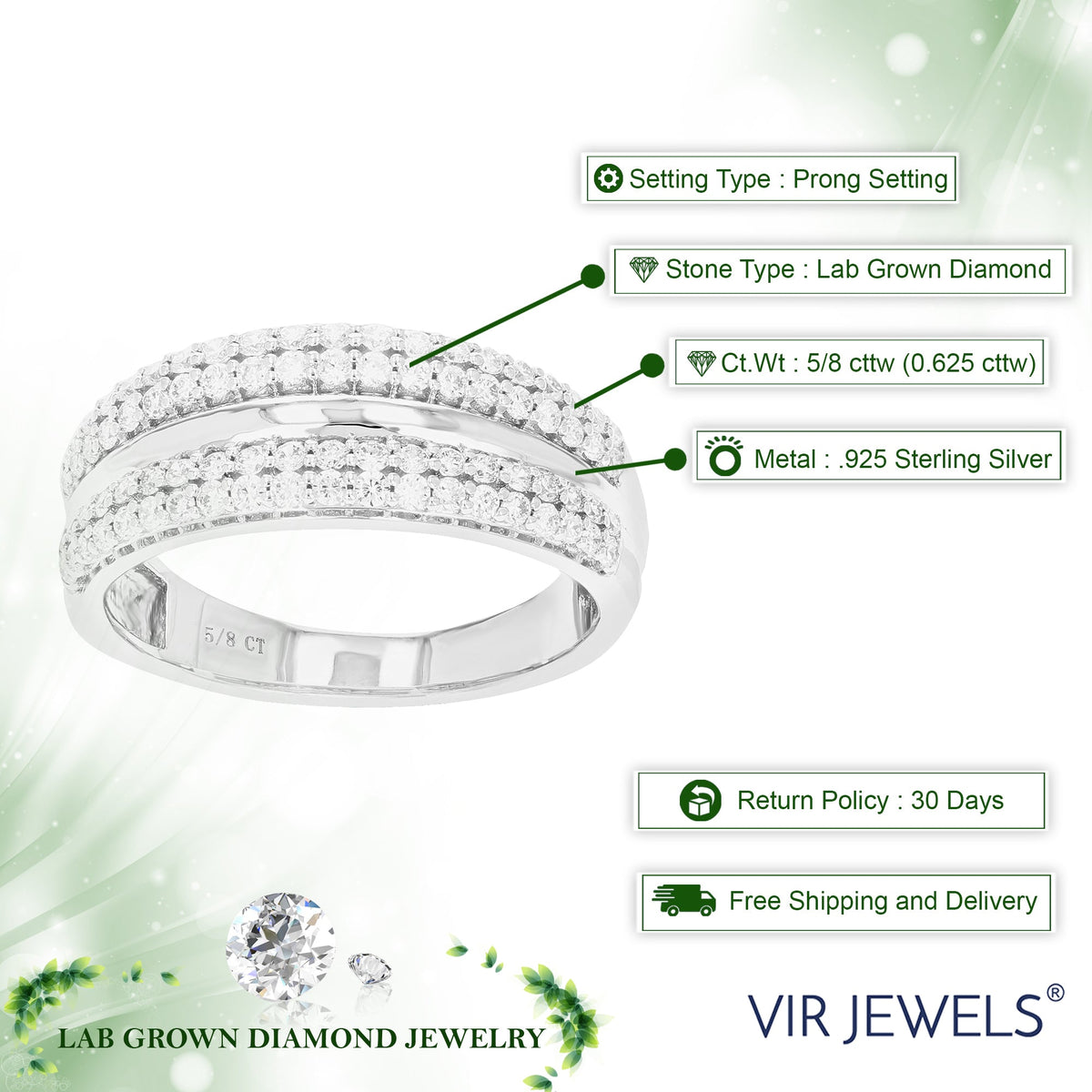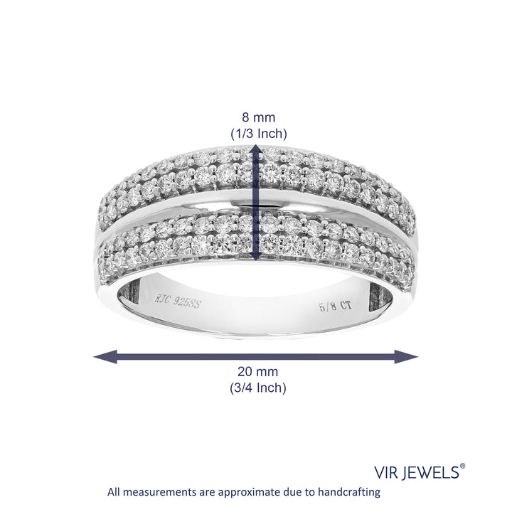 Handcrafted in .925 sterling silver, featuring 1/2 cttw lab-grown diamonds (80 stones). Round-cut diamonds with H-I color and SI1-SI2 clarity. Prong setting. Wedding band width: 8mm (1/3 inch).