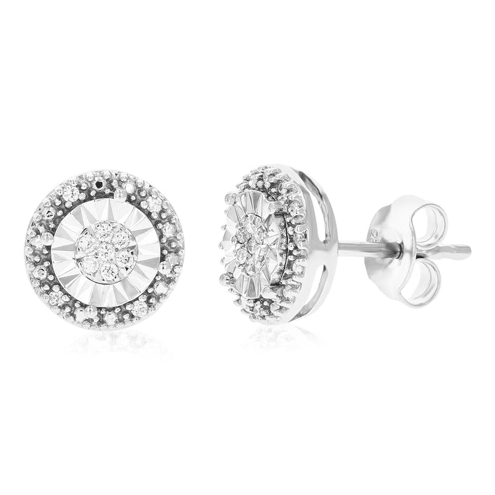 .925 Sterling silver, 1/10 carat total weight round lab-grown diamonds (22 stones). Diamond clarity: SI1-SI2. Earring size: 9mm x 9mm (1/3 inch). Push-back closure.
