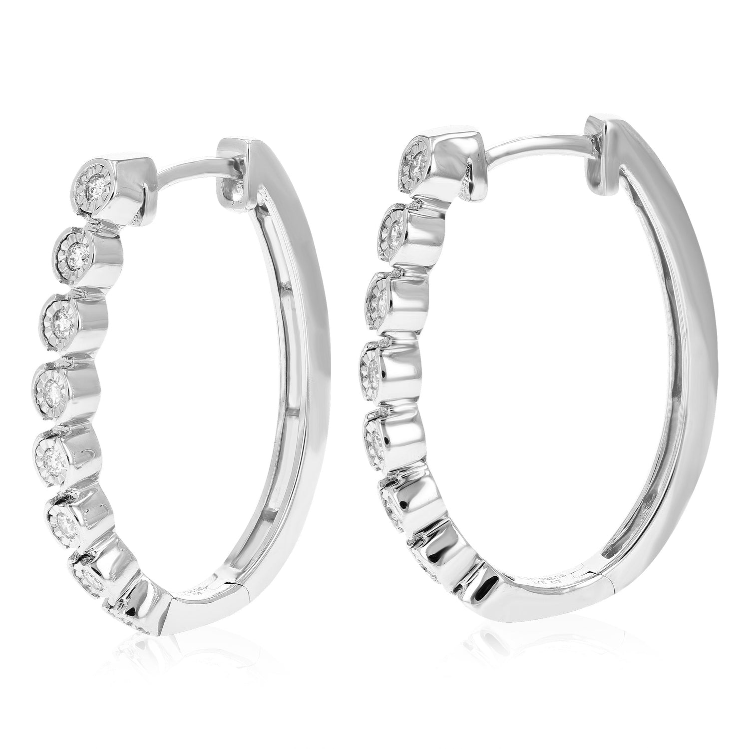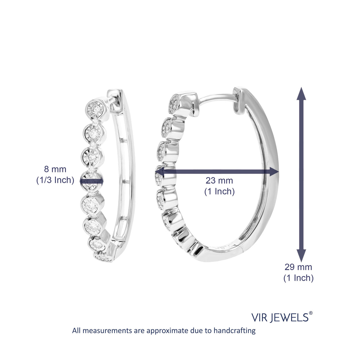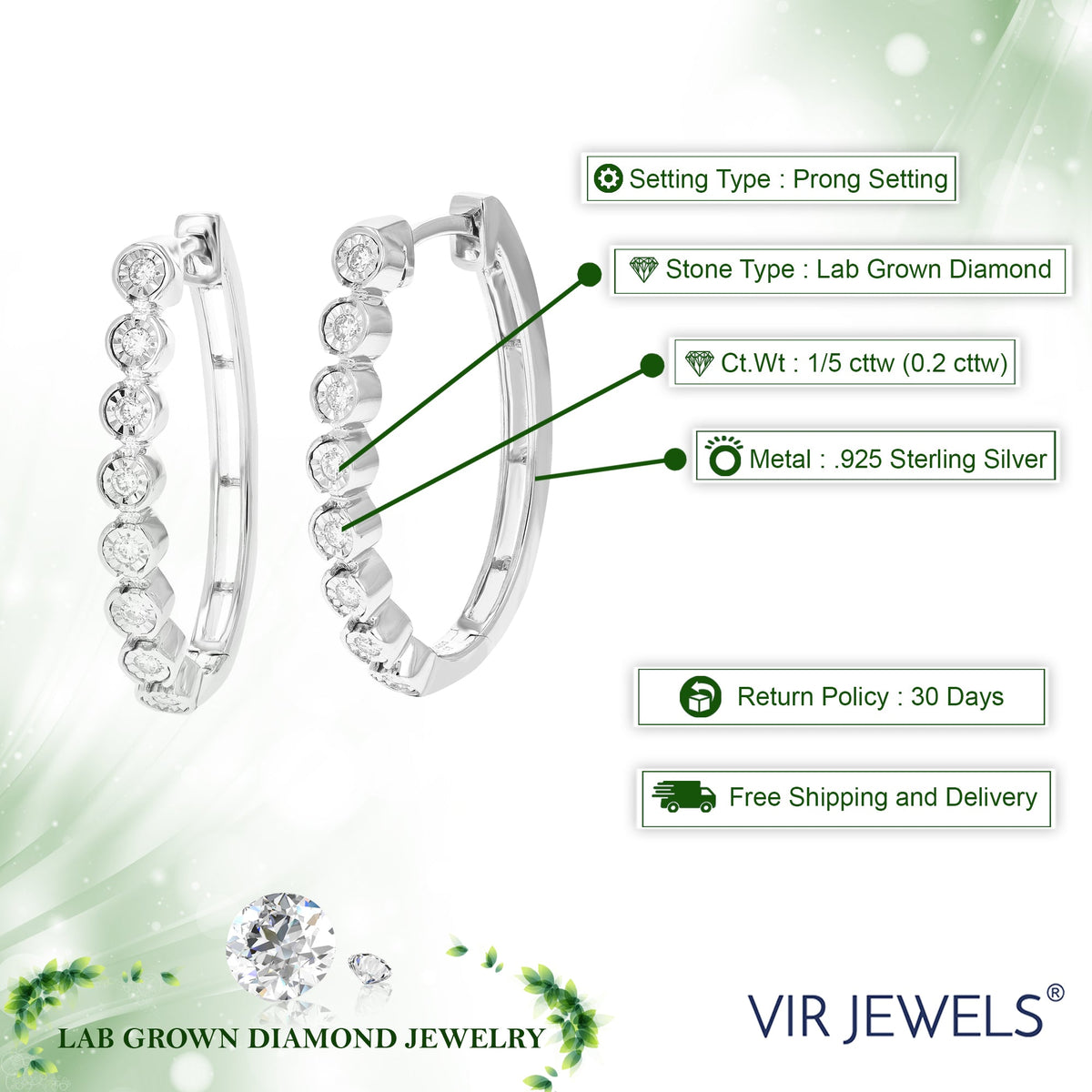 These 1/5 cttw Round Lab Grown Diamond Hoop Earrings by Vir Jewels showcase 16 round diamonds, each set in a prong setting for maximum brilliance. Crafted from .925 sterling silver, these earrings provide both elegance and durability. The prong setting ensures that the diamonds are securely held and their sparkle is elevated, making them the perfect accessory to complement any outfit.