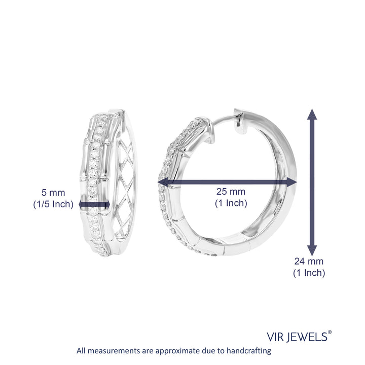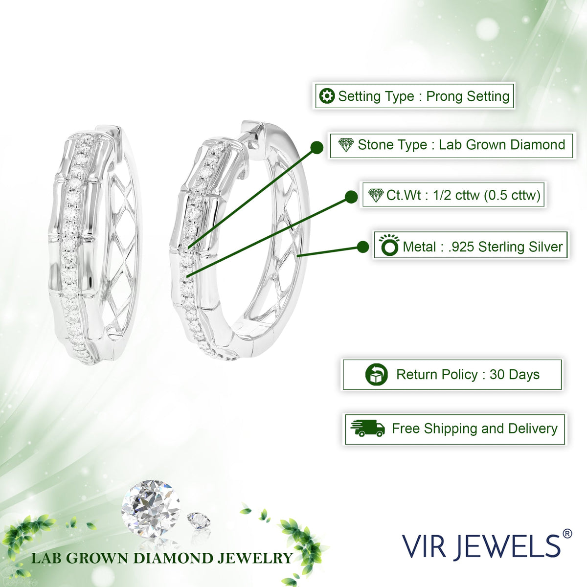 Handcrafted in .925 sterling silver with 40 round lab-grown diamonds (1/2 cttw). Diamond clarity: SI1-SI2, color: H-I. Prong setting. Hoop earrings width: 5 MM (1/5 Inch); Height: 24 MM (1 Inch).