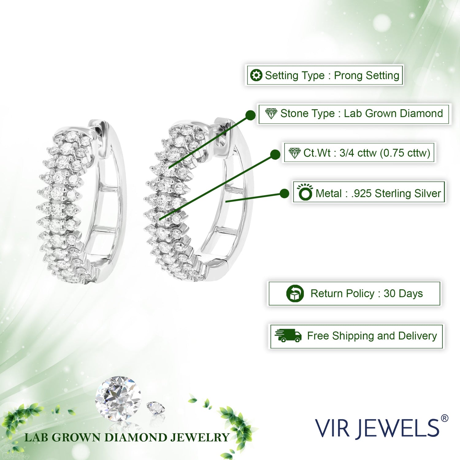 These 3/4 cttw Round Lab Grown Diamond Hoop Earrings by Vir Jewels feature 78 sparkling diamonds, carefully set in a prong setting for enhanced brilliance. Made with .925 sterling silver, these hoops offer both style and durability, perfect for any occasion.
