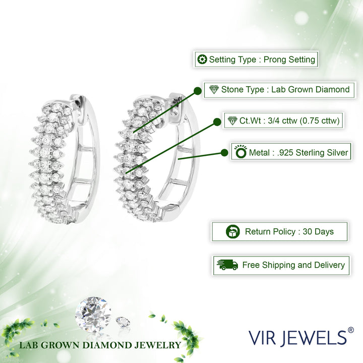 3/4 cttw 78 Stones Round Lab Grown Diamond Hoop Earrings .925 Sterling Silver Prong Set 3/4 Inch