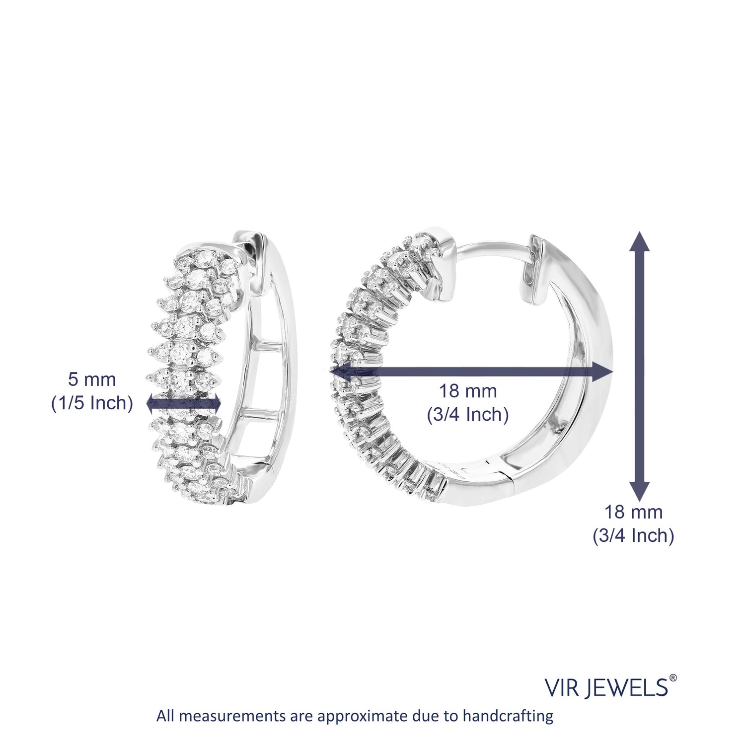 Handcrafted in .925 sterling silver with 78 round lab-grown diamonds (3/4 cttw). Diamond clarity: SI1-SI2, color: H-I. Prong setting. Hoop width: 5 MM (1/5 Inch); Height: 17 MM (2/3 Inch).