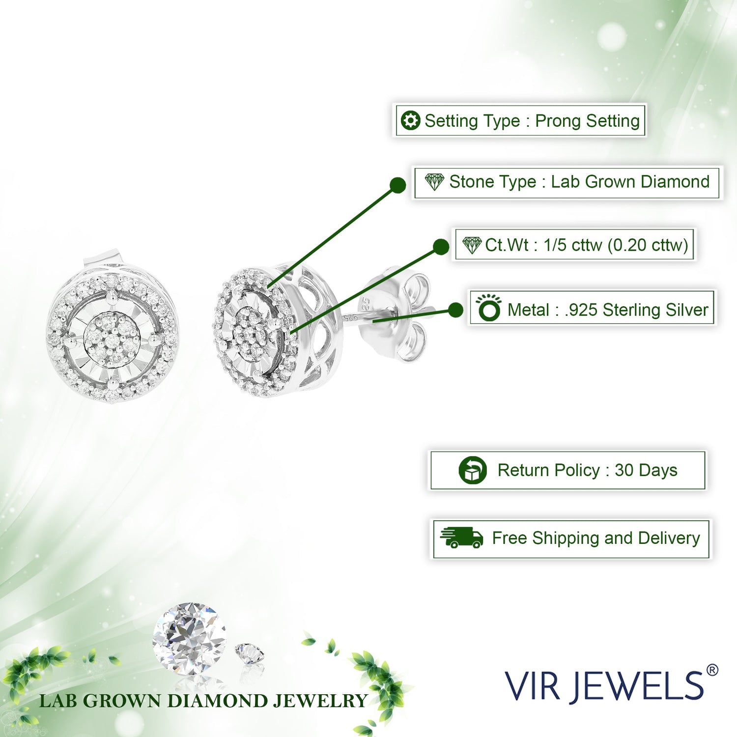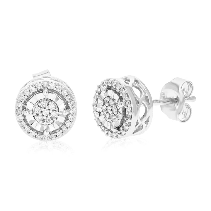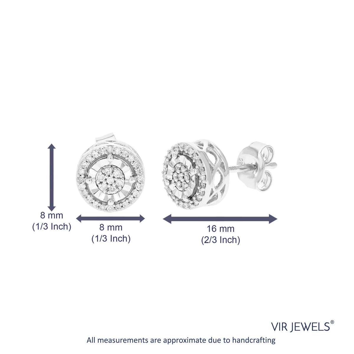 Set in .925 sterling silver with 62 round lab-grown diamonds totaling 1/5 cttw. Diamonds are H-I color, SI1-SI2 clarity. Prong setting for secure placement. Earring dimensions: 8mm (1/3 inch) in width and height.