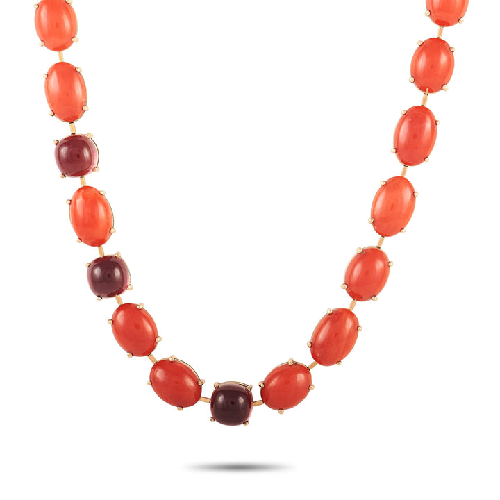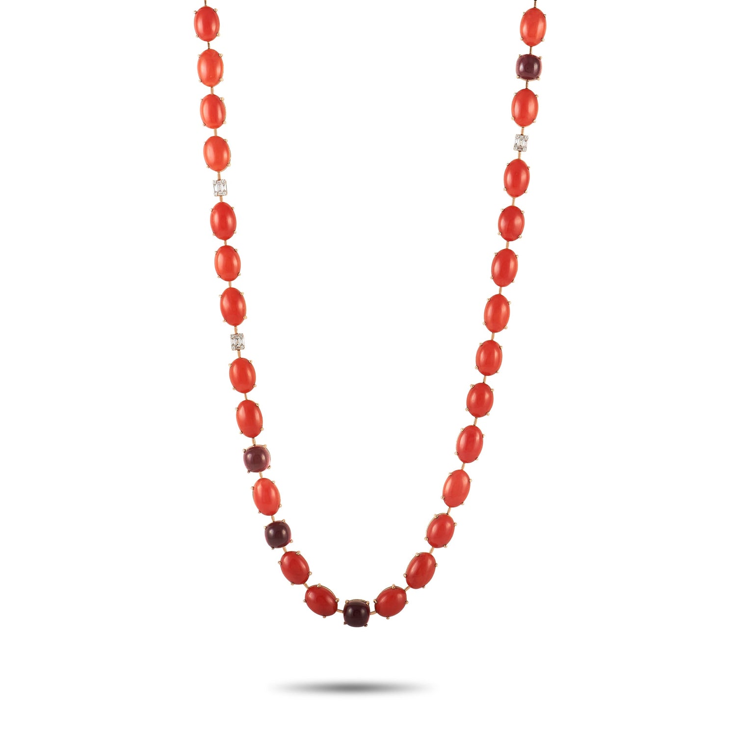 Crafted in 18K rose gold, featuring 0.56 CT diamonds, 141.40 CT coral, and 20.64 CT tourmaline. Secured with a box clasp and measures 31.75 inches in length.