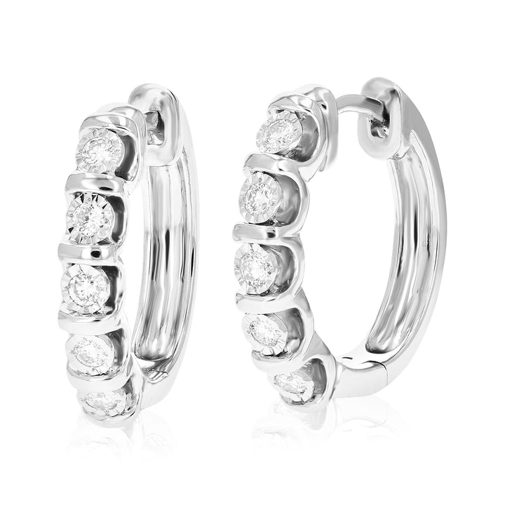 Handcrafted in .925 sterling silver with 10 round lab-grown diamonds (1/4 cttw). Diamond clarity: SI1-SI2, color: H-I. Bezel setting. Hoop earrings width: 3 MM (1/10 Inch); Height: 16 MM (2/3 Inch).