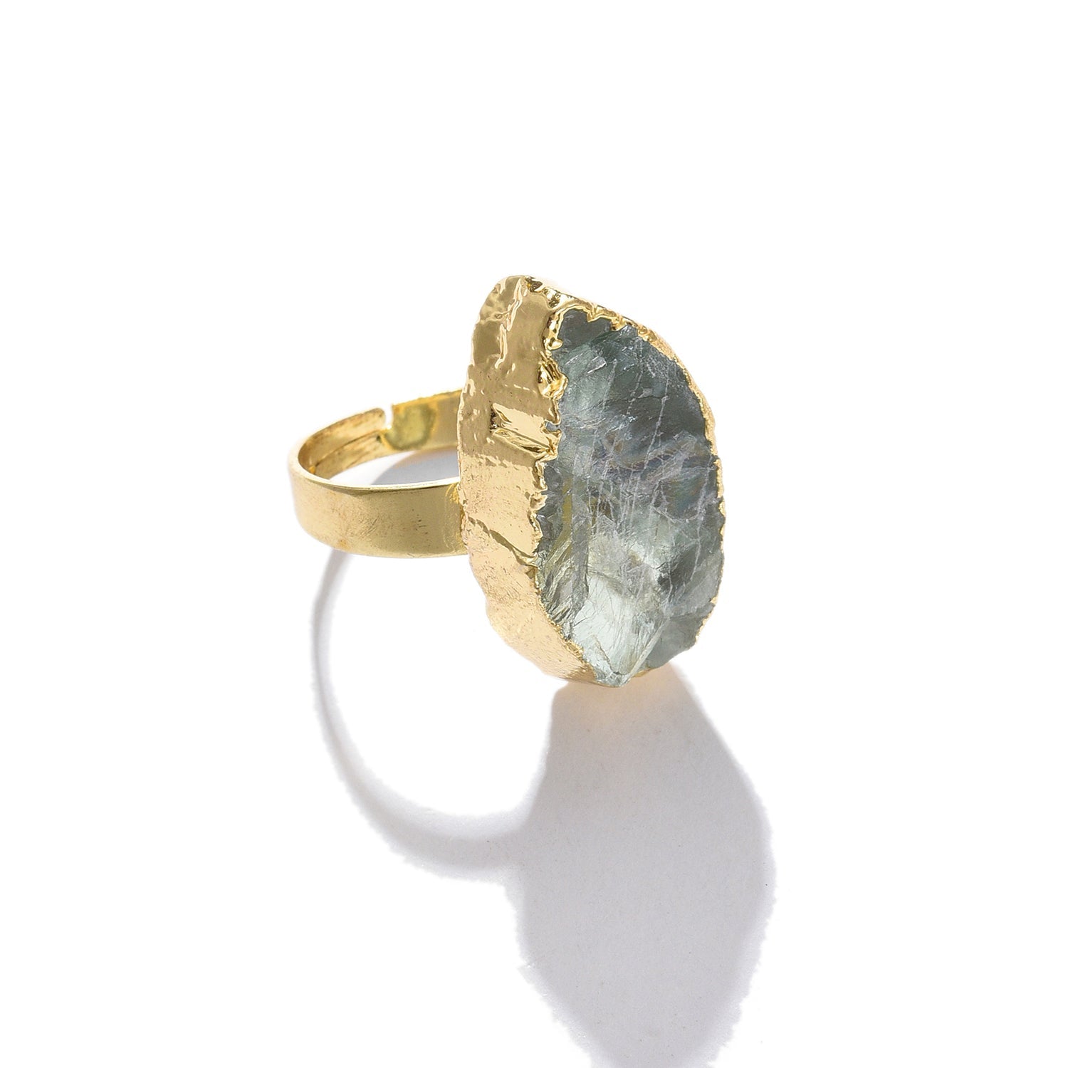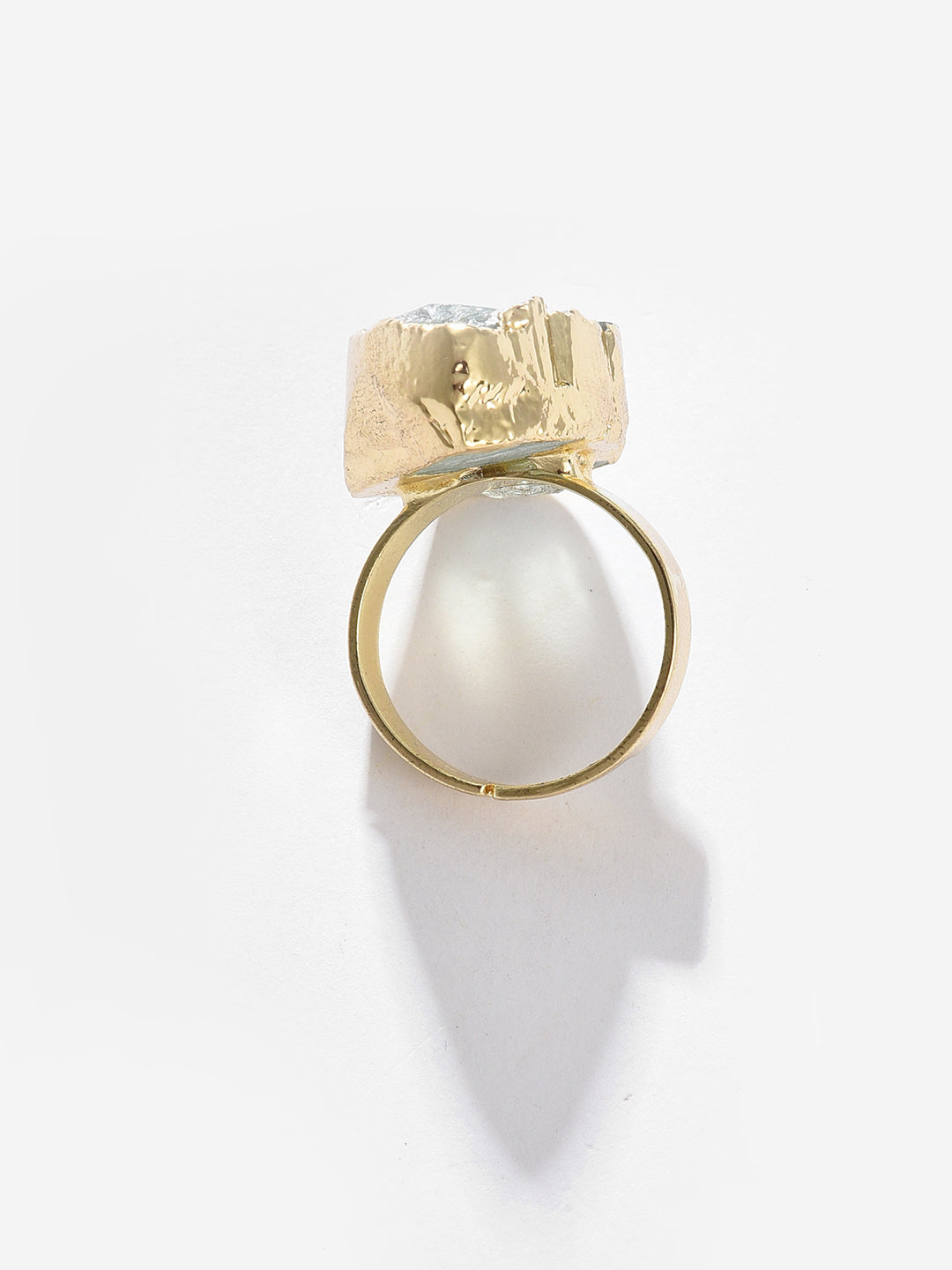 Gold-plated metal with blue studded stones. Adjustable to fit most ring sizes.