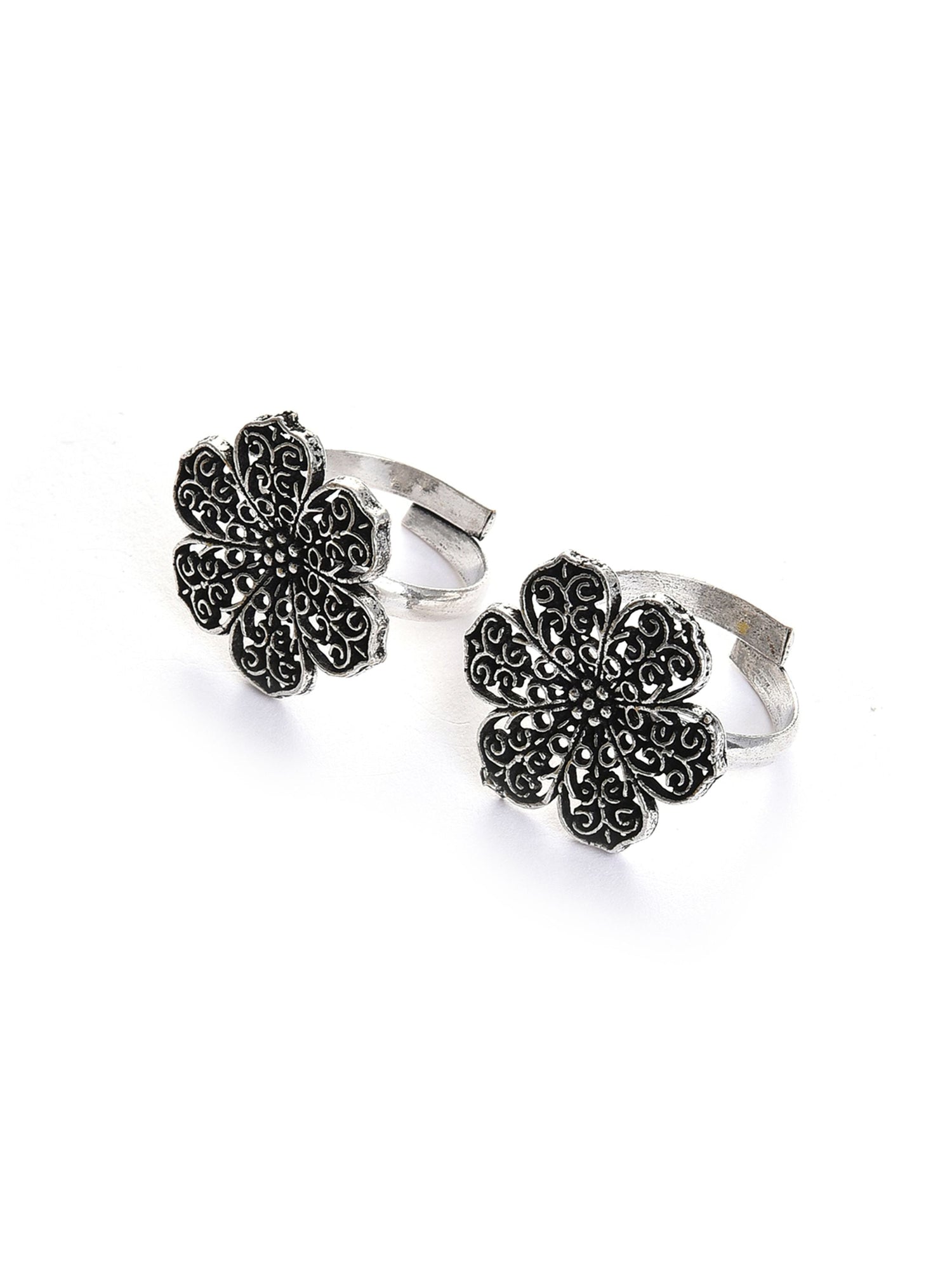 These Oxidised Toe Rings by SOHI are the perfect ode to self-expression. Crafted with intricate designs, these rings are a fantastic way to show the world more of who you are. Their oxidized finish adds a unique touch, making them a stylish and timeless accessory. They are versatile enough to pair with any outfit and will make a bold statement whether you're dressed up or down. They are adjustable, ensuring a comfortable fit for any toe size, making them a perfect gift or addition to your collection.