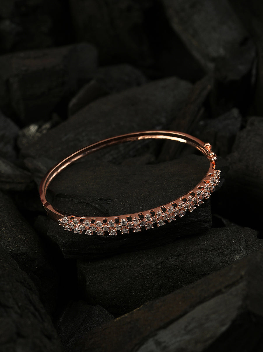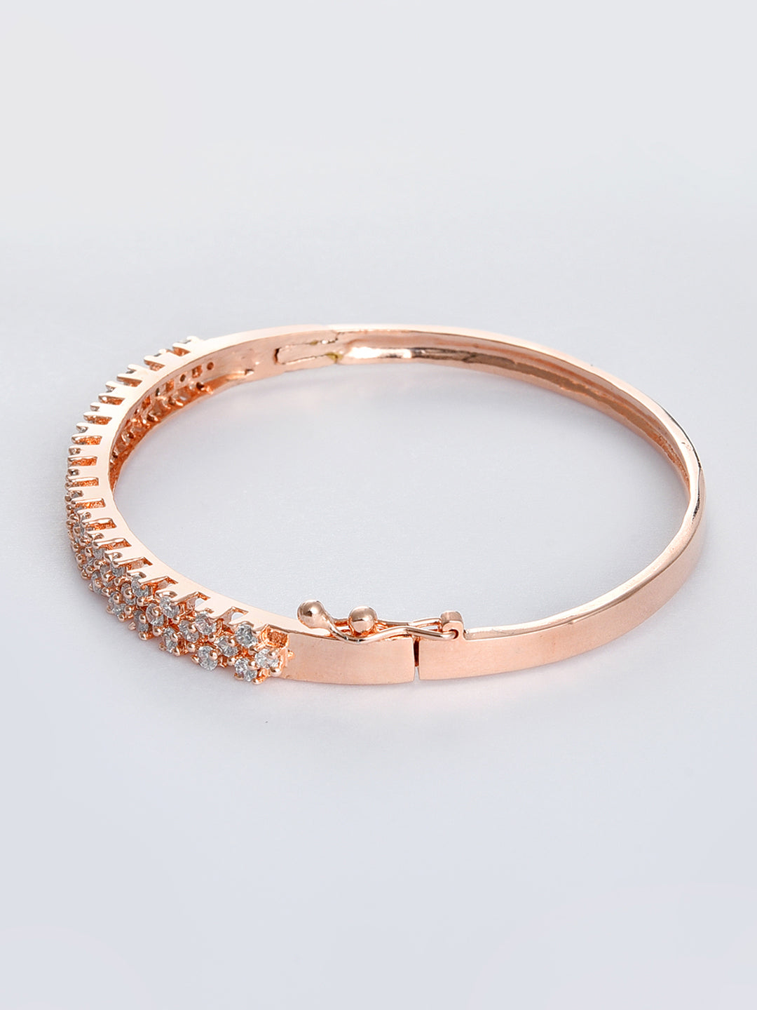 Crafted in rose gold-plated metal with American diamond accents. Features a bangle-style silhouette for an elegant yet comfortable fit.