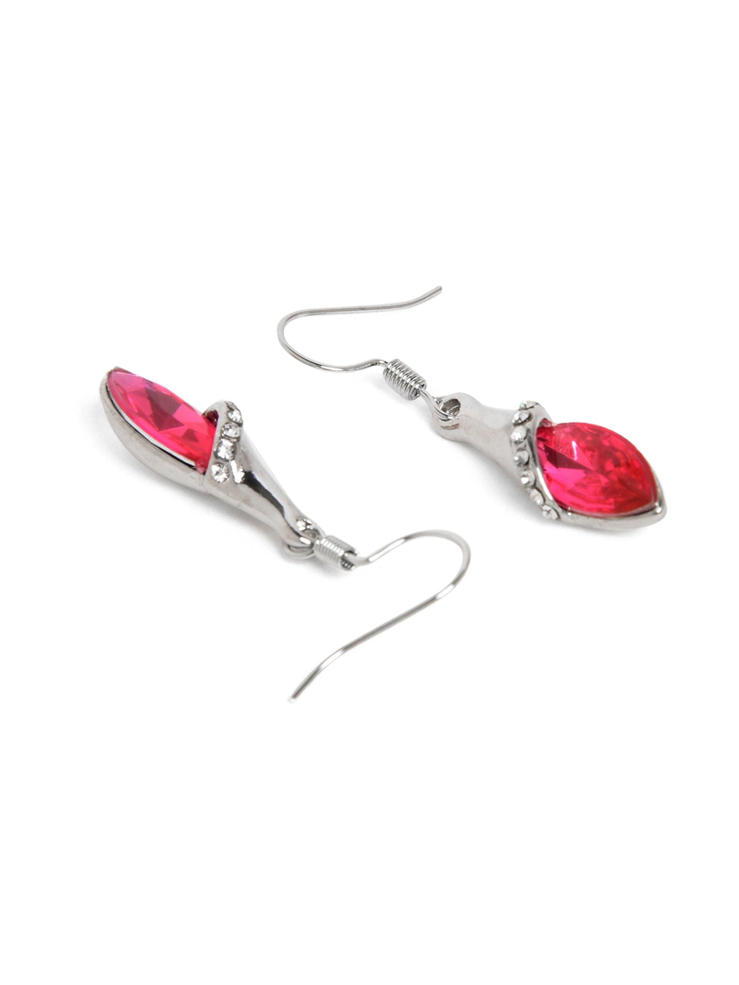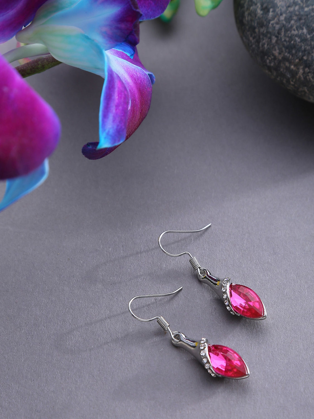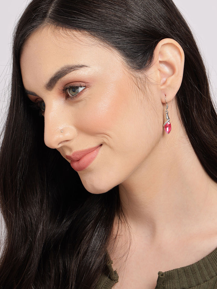 Pink Silver-toned Studded Leaf Shaped Drop Earrings