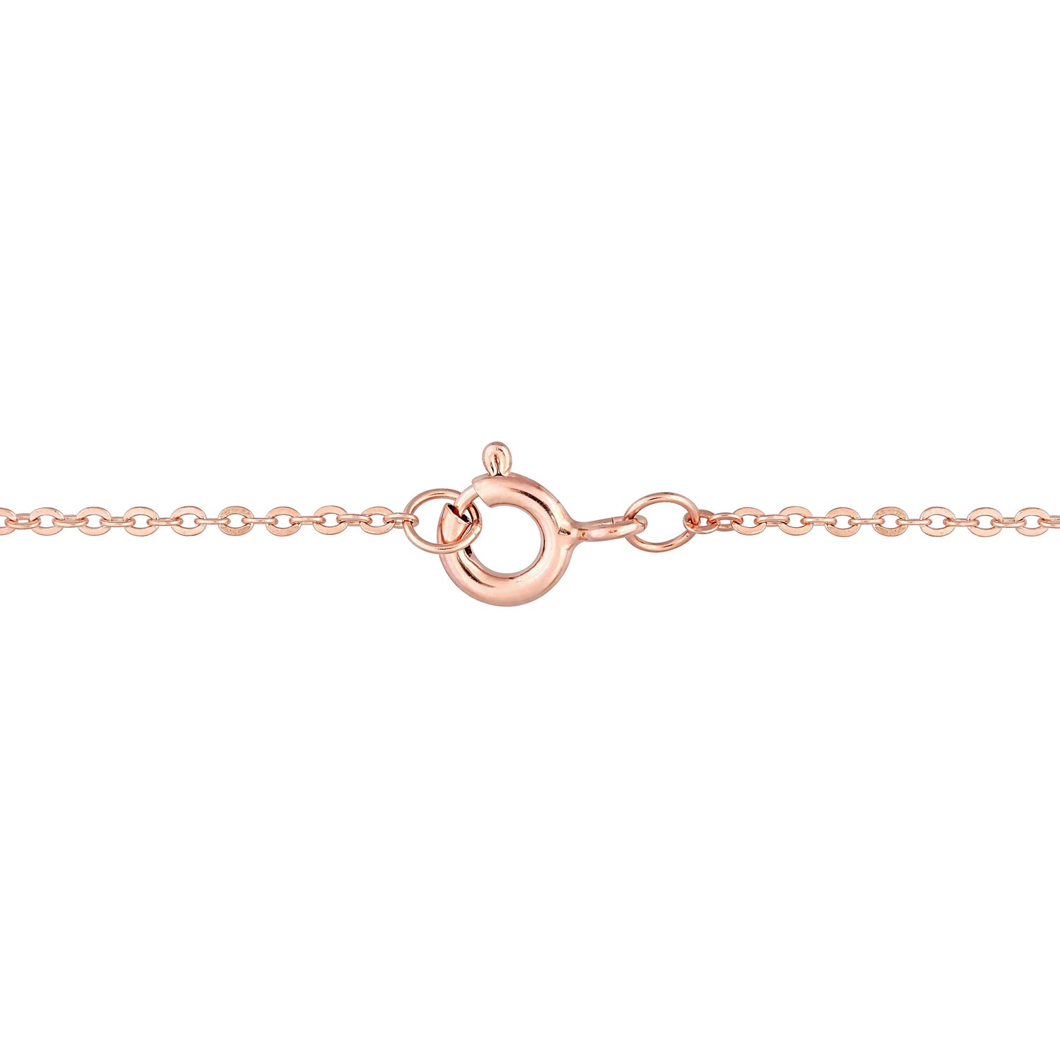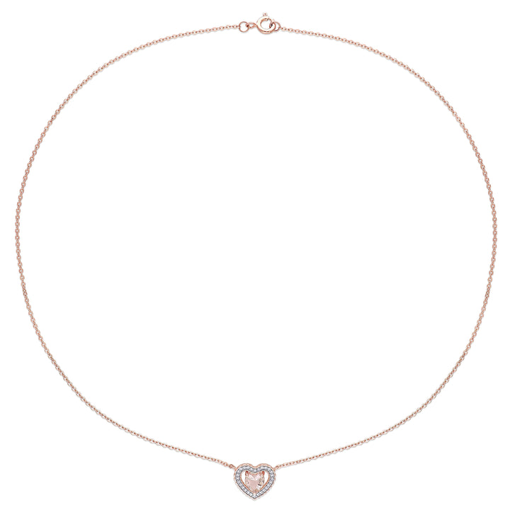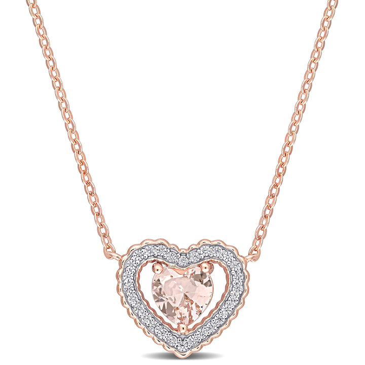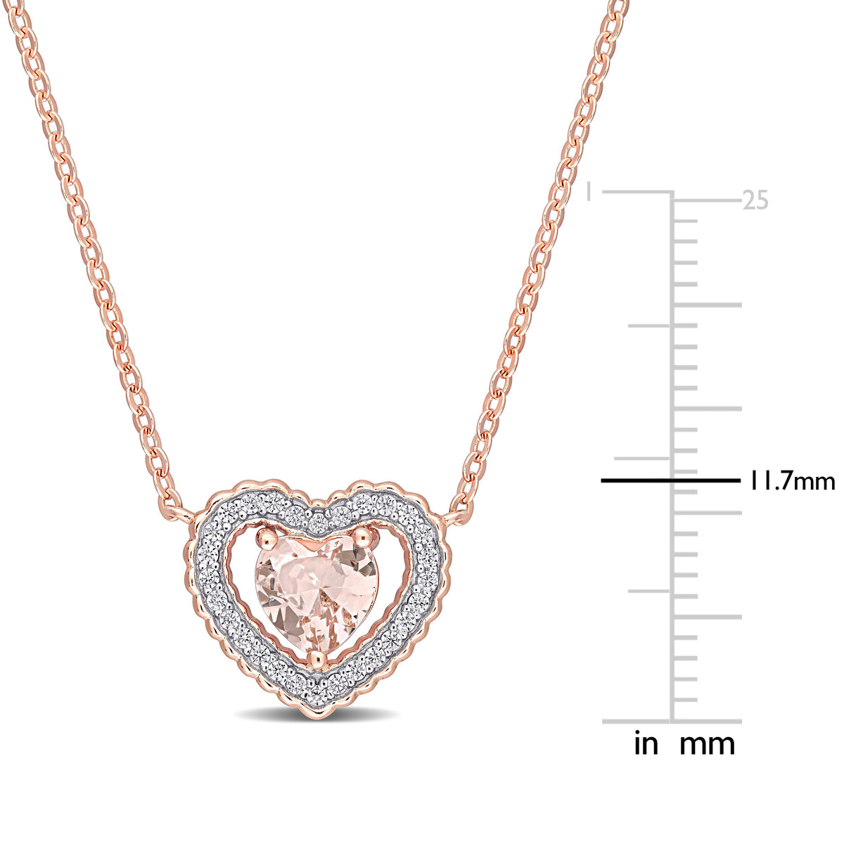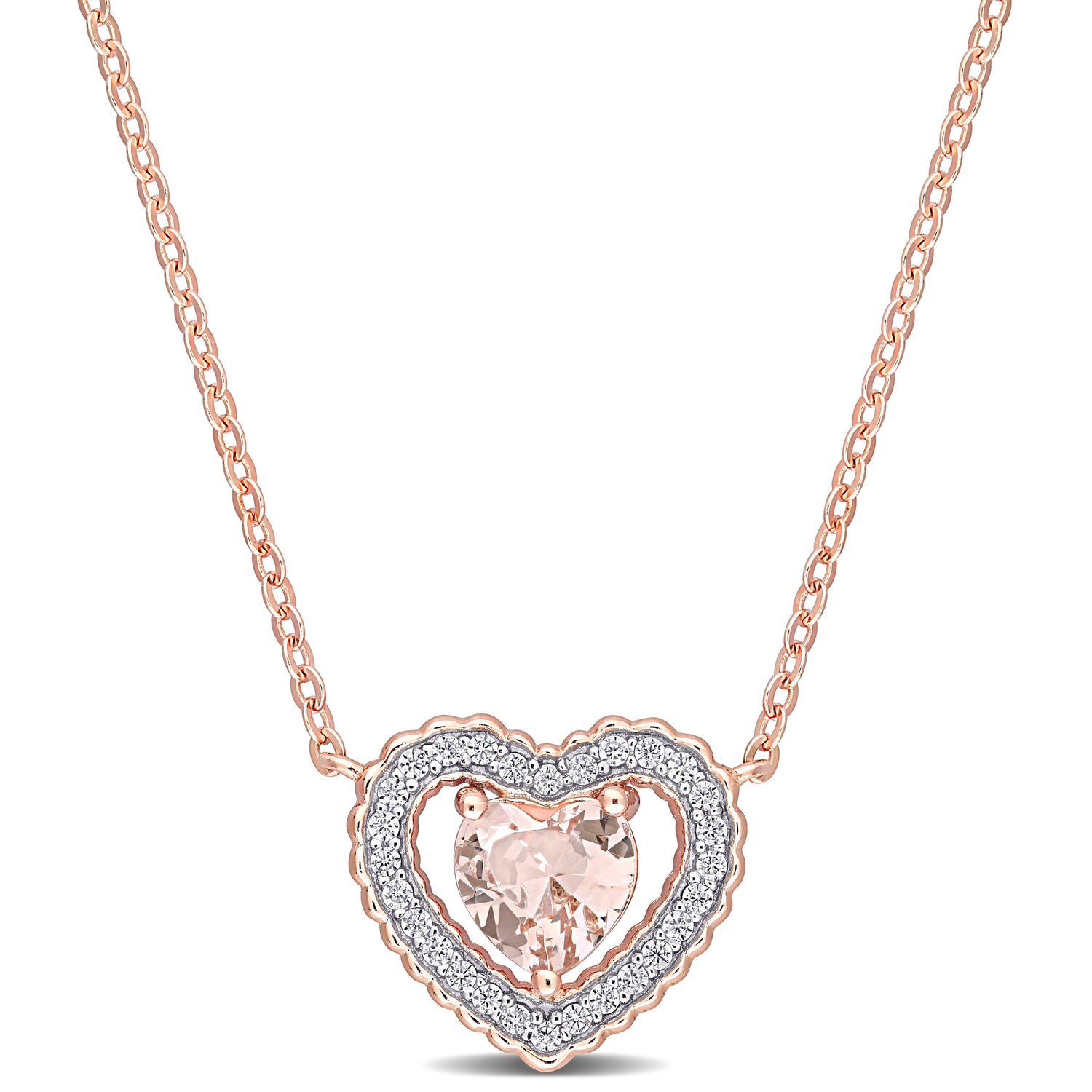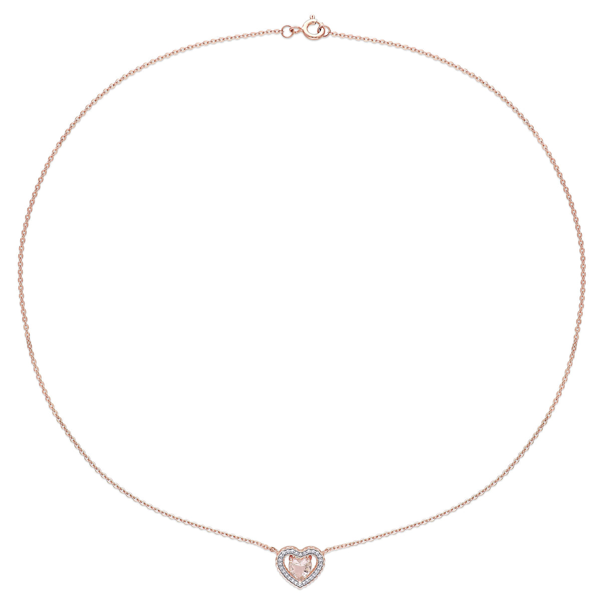 1 prong-set heart-cut simulated morganite (5/8ct), 28 prong-set round-cut cubic zirconia (1/4ct). Rose-plated sterling silver. 18-inch cable chain with spring ring clasp.