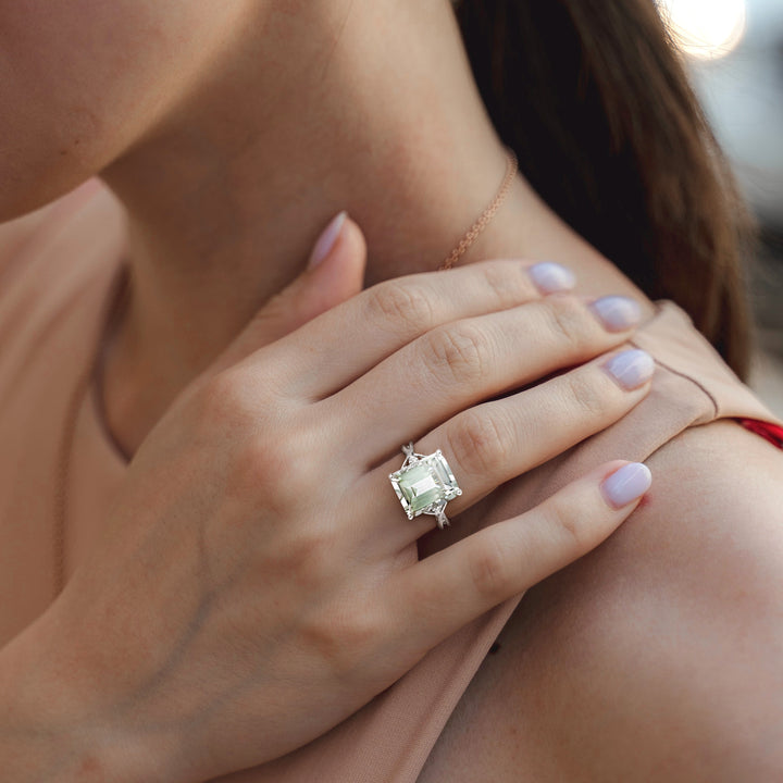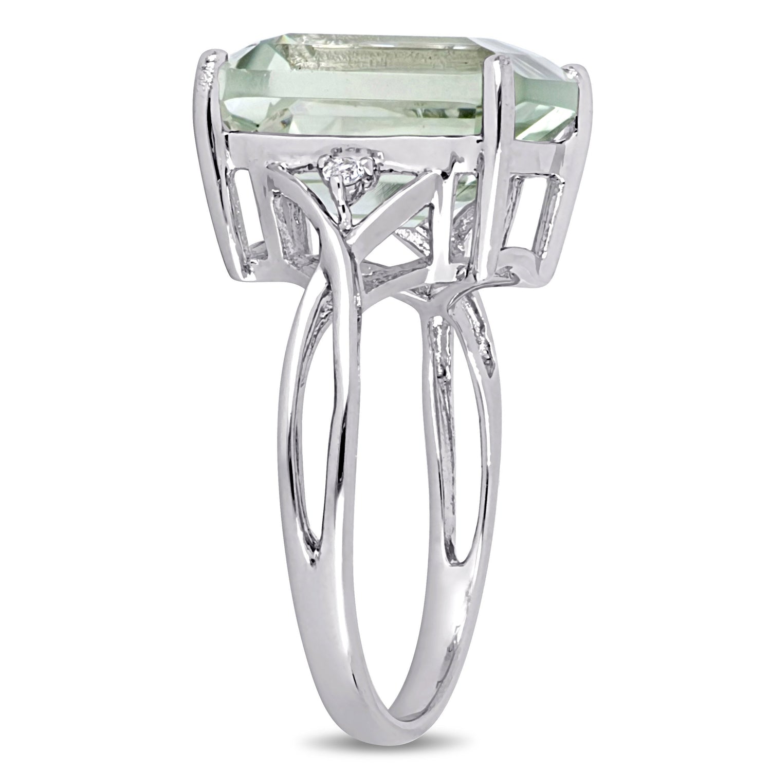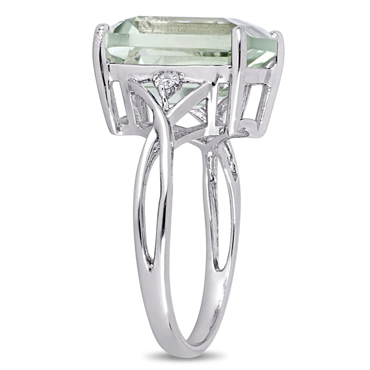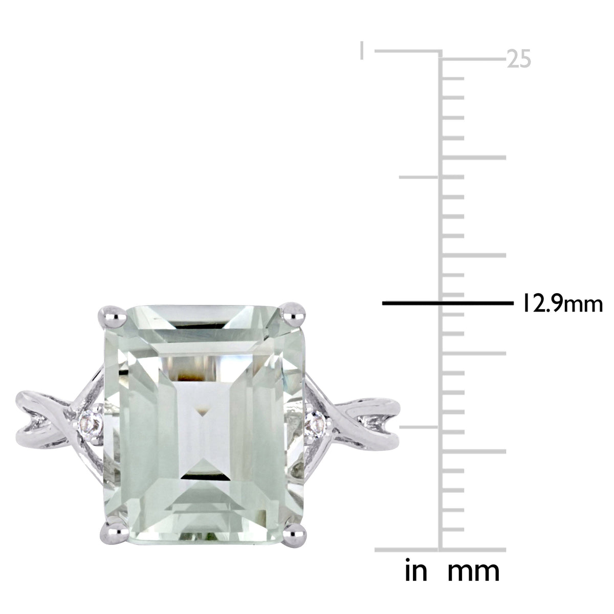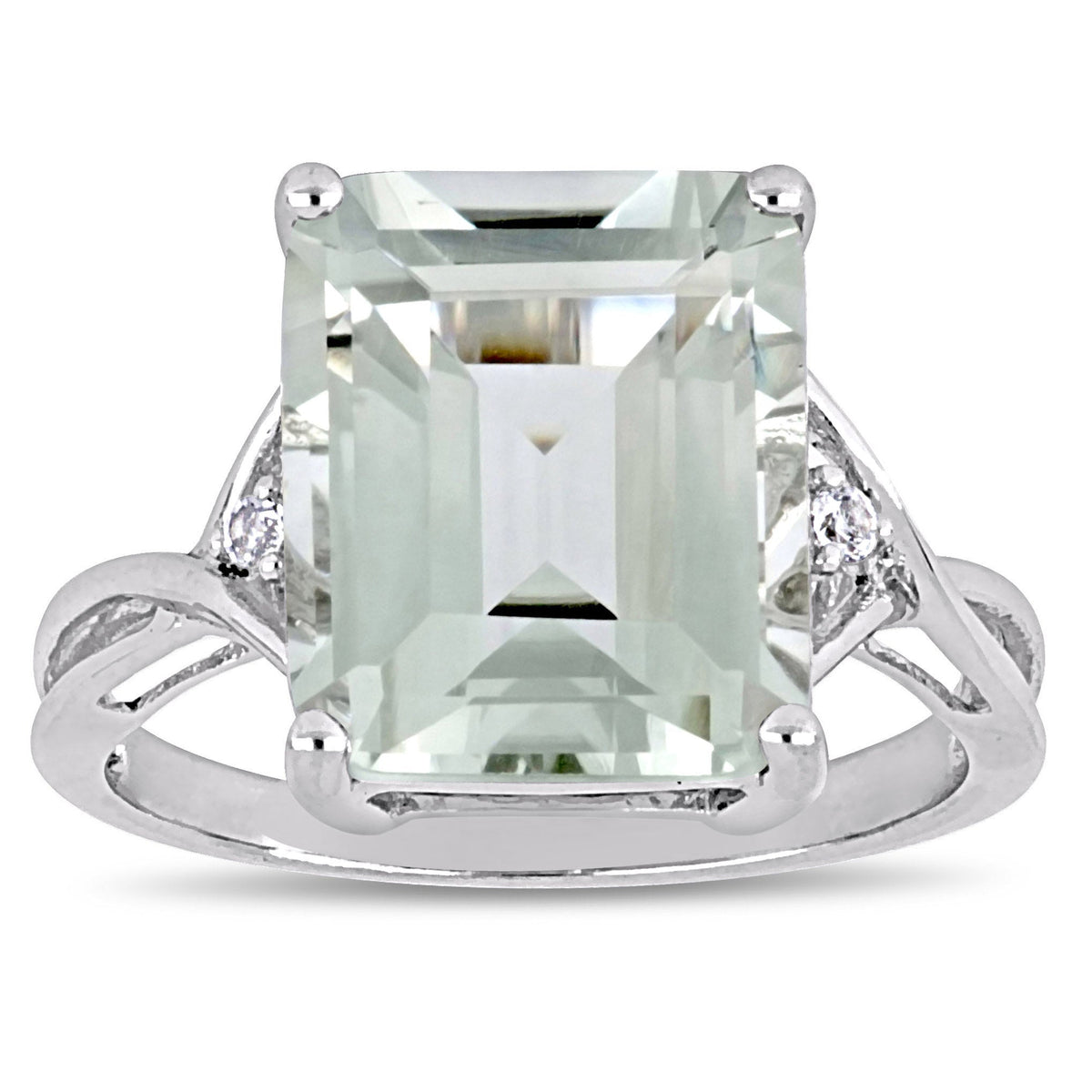 1 prong-set square-cut green amethyst (10mm x 12mm), 2 prong-set round-cut white topaz (1.5mm each). Total gemstone weight: 5 5/8ct. Sterling silver.