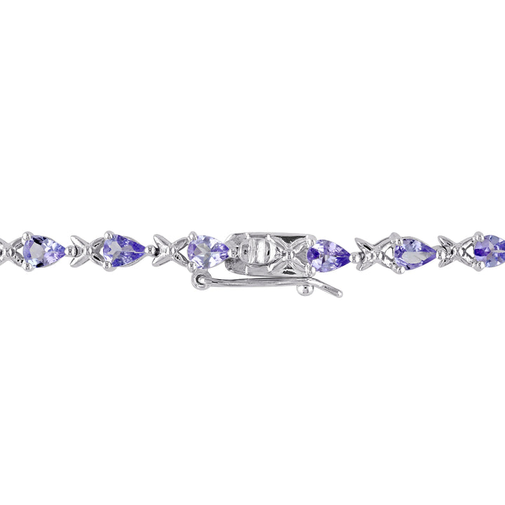 The Mimi & Max 4 1/3ct TGW Tanzanite X-Link Bracelet in Sterling Silver is a bold and beautiful piece, featuring pear-cut Tanzanite gemstones set in sterling silver. This elegant tennis bracelet is designed to make a statement with its vibrant blue hue, perfect for showing your commitment or adding an eye-catching piece to your collection. The bracelet is secured with a pressure tongue clasp, ensuring it stays comfortably in place.