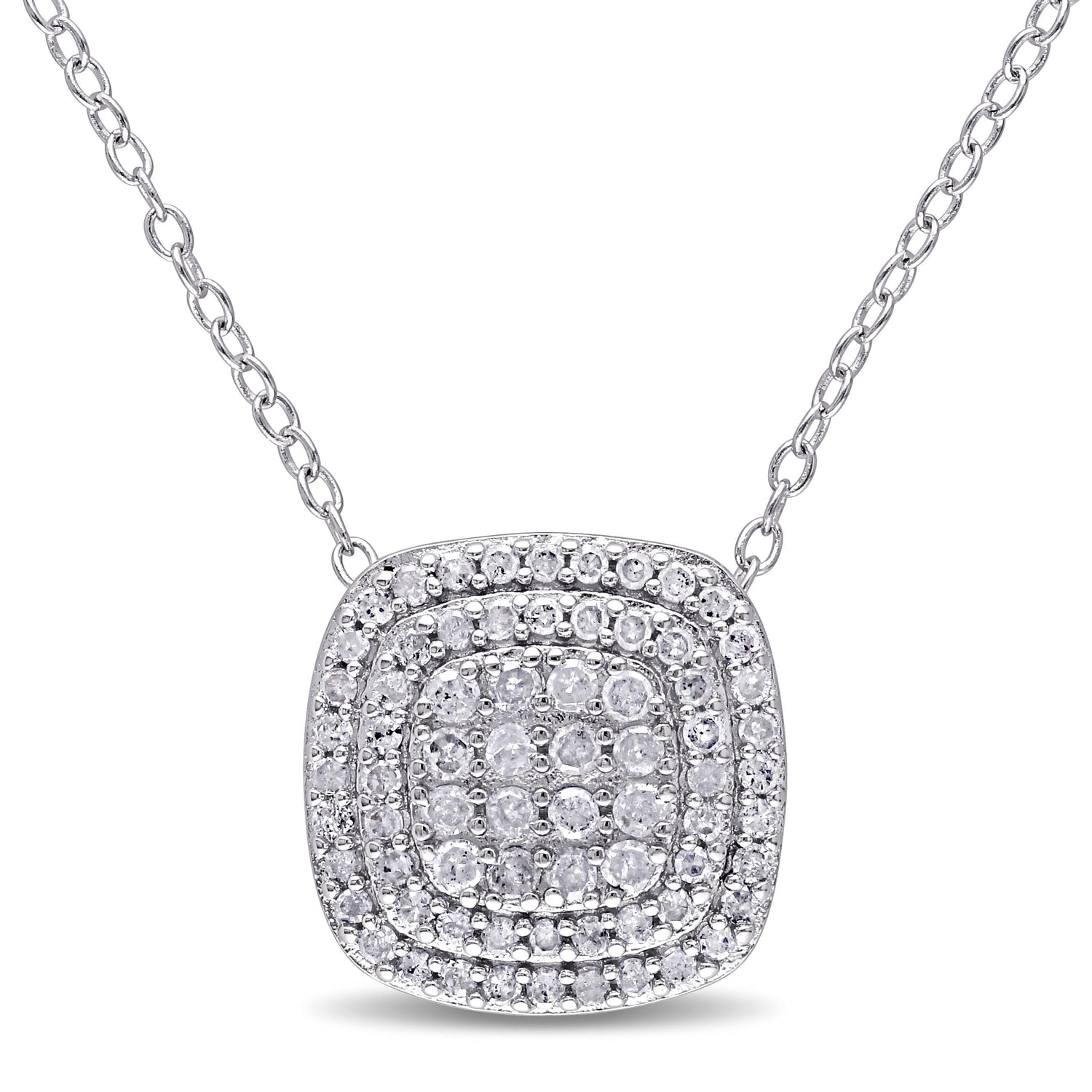 72 round white diamonds (0.50 carat total weight). Sterling silver. 18-inch cable chain with spring ring clasp. Pendant dimensions: 12.8 mm x 12.8 mm.