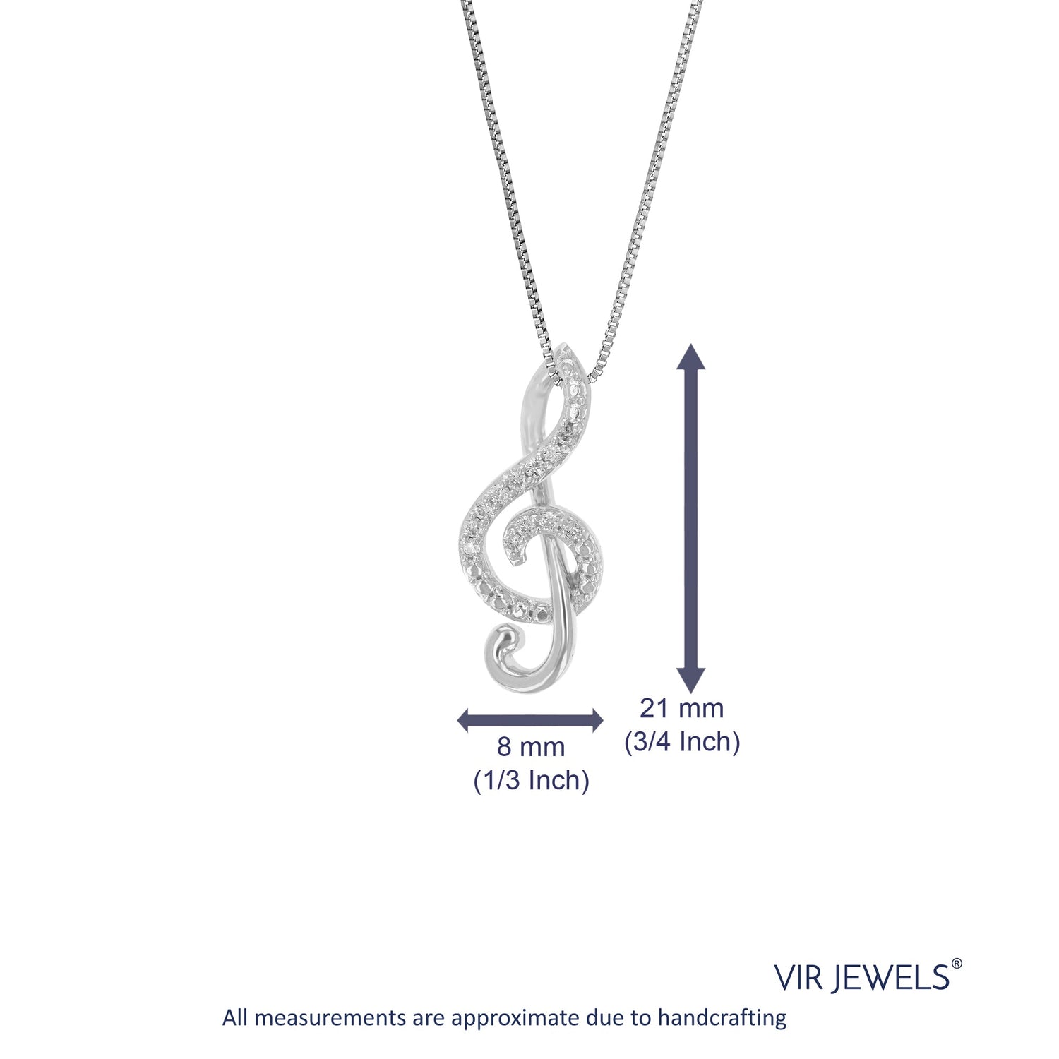 This 1/10 cttw Lab Grown Diamond Music Pendant Necklace by Vir Jewels features 12 sparkling round diamonds set in .925 sterling silver. The prong setting ensures the diamonds’ brilliance is maximized, while the sterling silver metal complements their shine. With a pendant width of 7 mm and a length of 18 mm, this necklace is designed to add a touch of sophistication to any outfit. A timeless and elegant piece, it makes for the perfect gift or personal keepsake.
