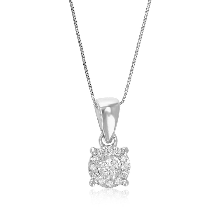 Handcrafted in .925 sterling silver, featuring 1/10 cttw lab-grown diamonds (13 stones). Round-cut diamonds with H-I color and SI1-SI2 clarity. Prong setting. Pendant dimensions: Width - 6mm (1/4 inch), Length - 11mm (2/5 inch). Includes an 18-inch chain.
