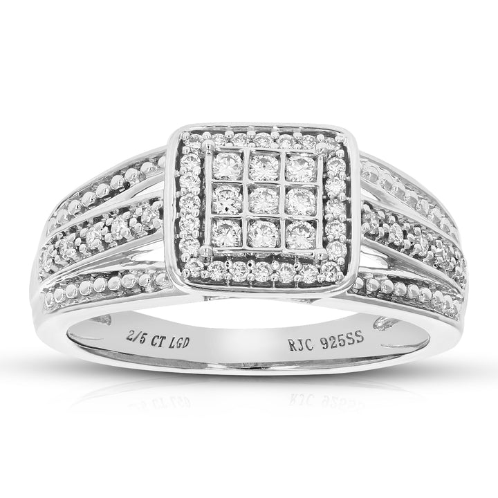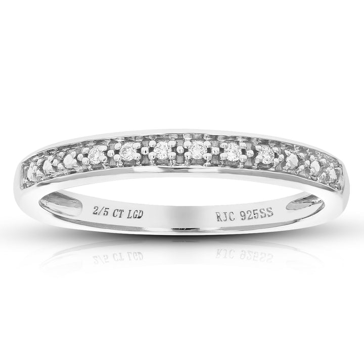 Crafted in .925 sterling silver, featuring 55 round-cut lab-grown diamonds (2/5 cttw) in H-I color, SI1-SI2 clarity. Engagement ring width: 8 mm (1/3 inch), length: 20 mm (3/4 inch). Wedding band width: 3 mm. Secure prong setting.