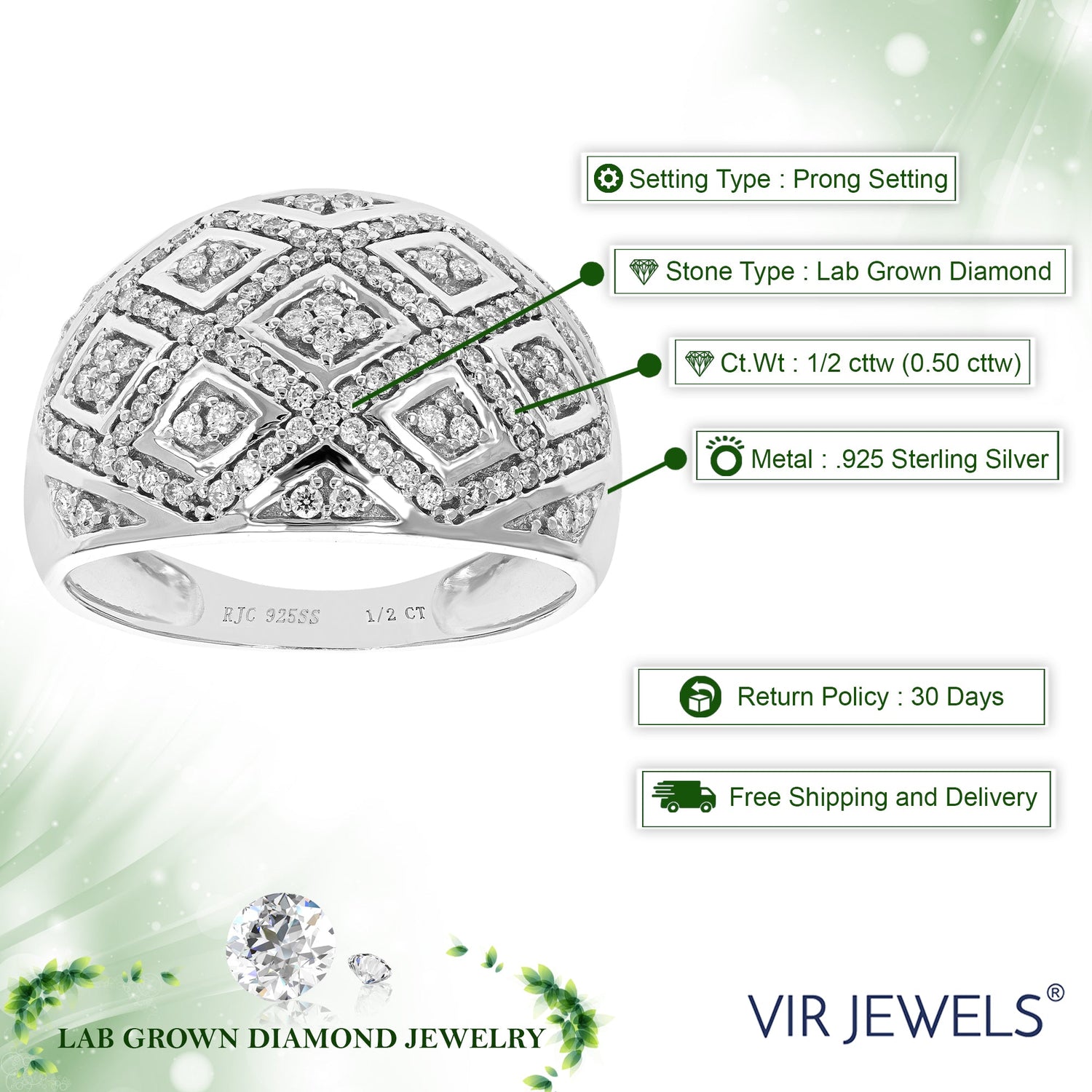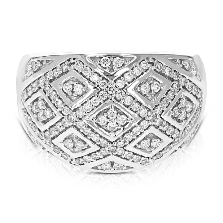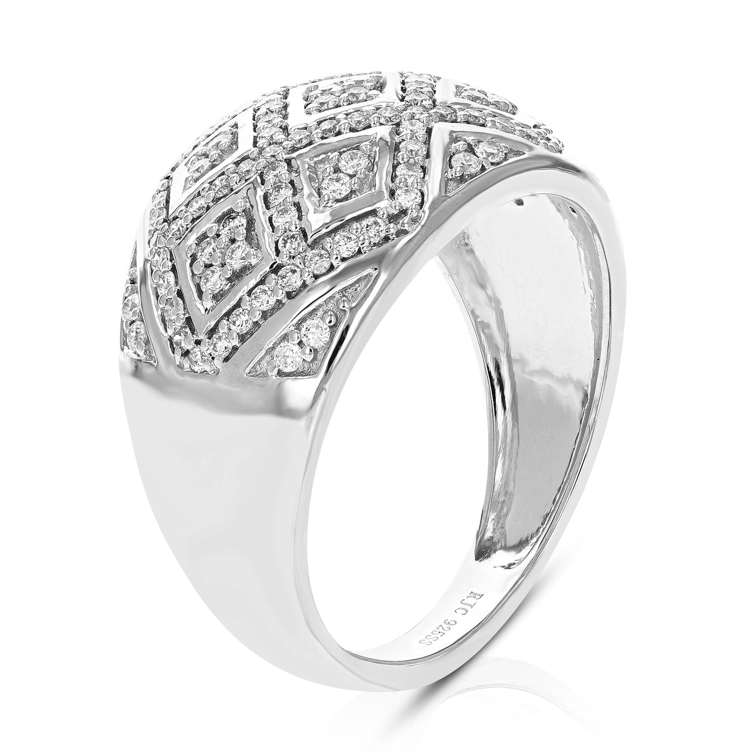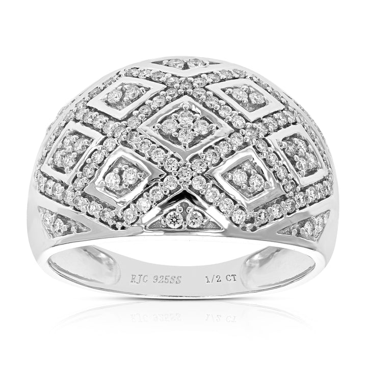 Crafted in .925 sterling silver with 114 round lab-grown diamonds totaling 1/2 cttw. Diamonds are H-I color, SI1-SI2 clarity. Prong setting for secure placement. Ring width: 14mm (1/2 inch), length: 22mm (3/4 inch).