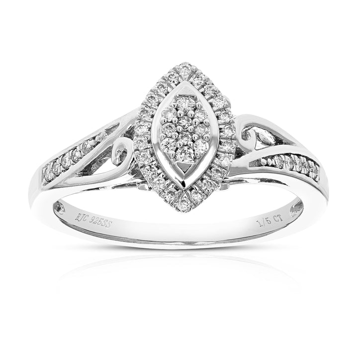 Handcrafted in .925 sterling silver with 42 round-cut lab-grown diamonds, totaling 1/5 cttw. Diamond color H-I, clarity SI1-SI2. Prong setting for secure and brilliant diamond display. Engagement ring width: 10mm (2/5 inch).