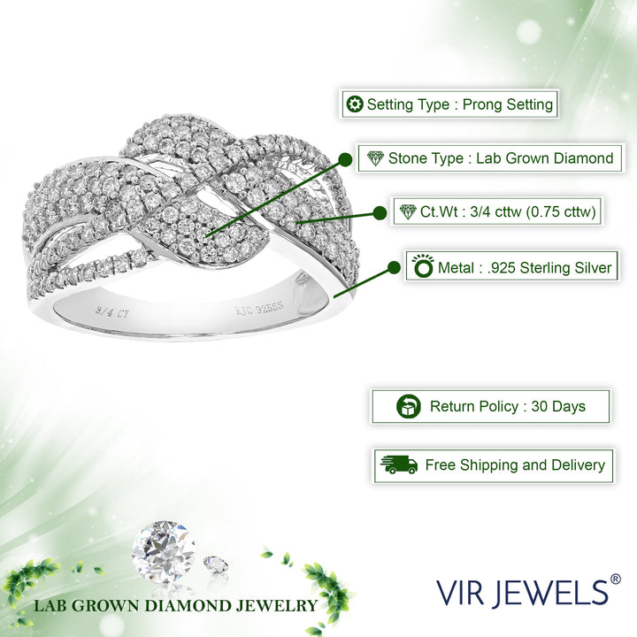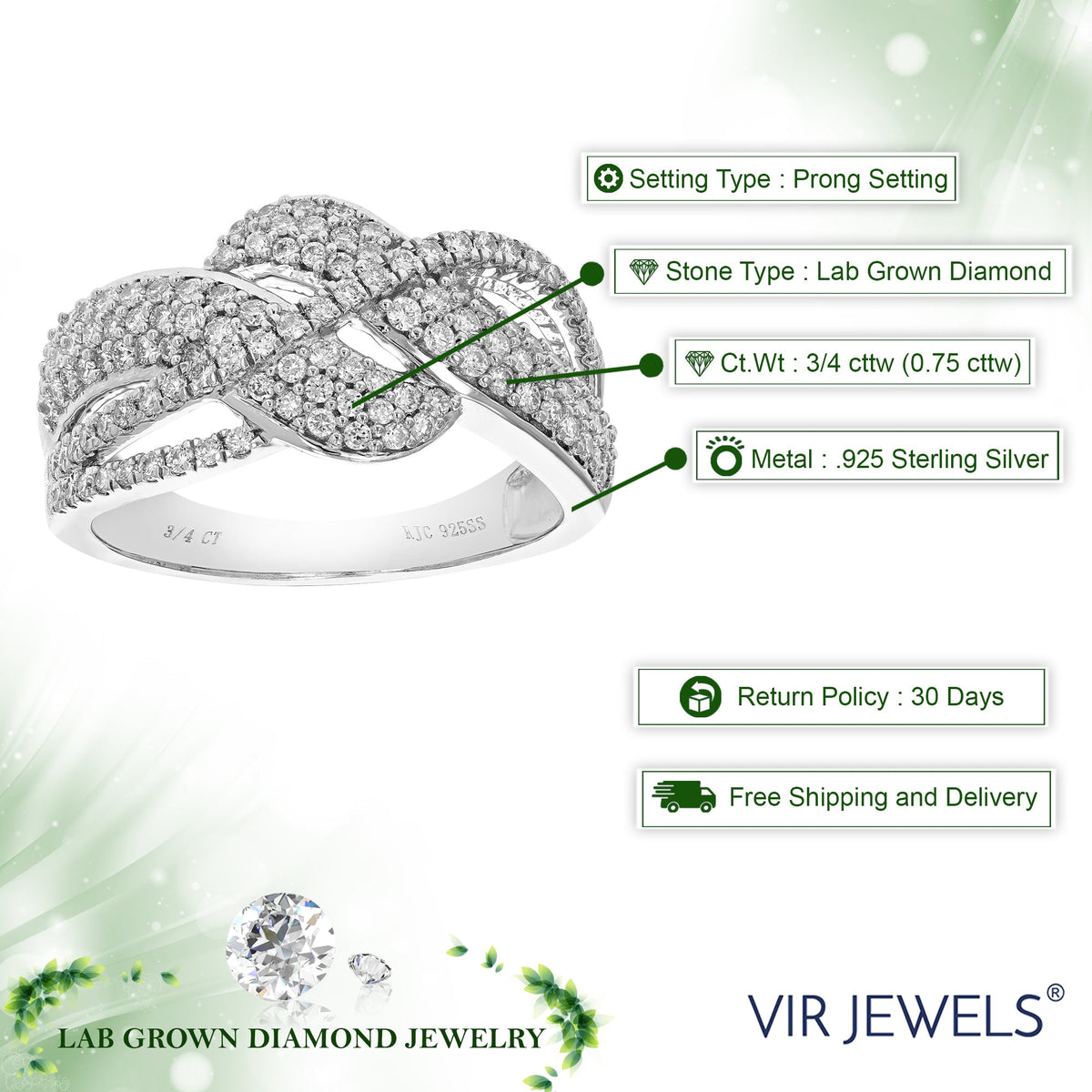 Set in .925 sterling silver with 121 round lab-grown diamonds totaling 3/4 cttw. Diamonds are H-I color, SI1-SI2 clarity. Prong setting for secure placement. Ring dimensions: 11mm (2/5 inch) in width, 21mm (3/4 inch) in length.