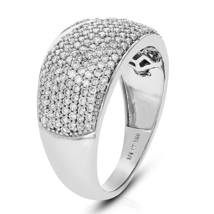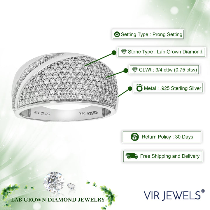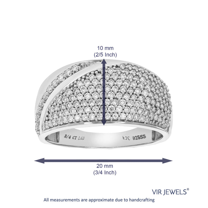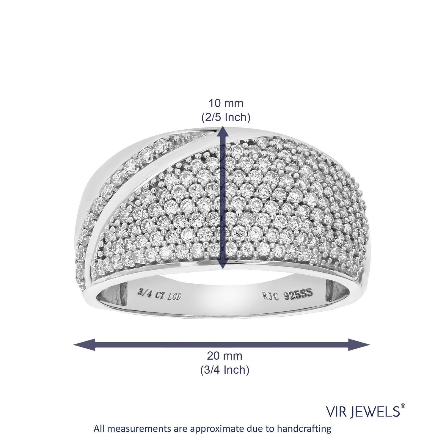 The 3/4 cttw Round Cut Lab Grown Diamond Wedding Band by Vir Jewels is a classic and elegant design with 148 round diamonds set in prong settings. Made of .925 sterling silver, this wedding band has a width of 10 mm (2/5 inch) and represents timeless love.