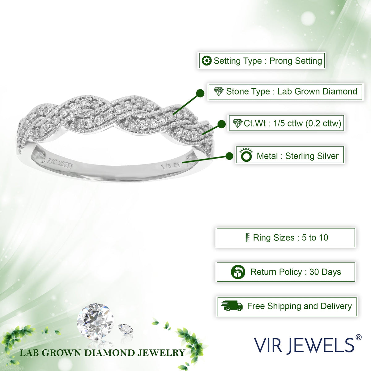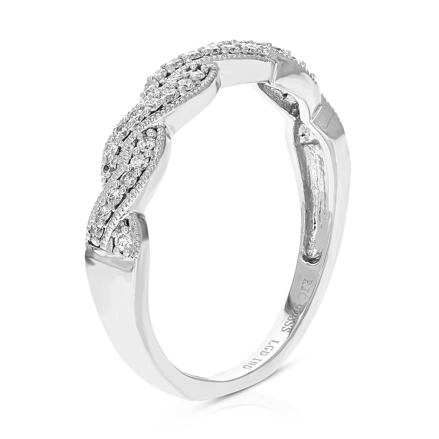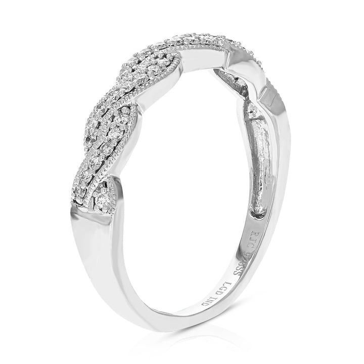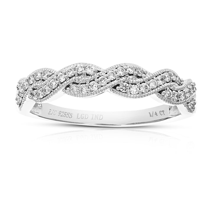 Handcrafted in .925 sterling silver with 38 round-cut lab-grown diamonds, totaling 1/5 cttw. Diamond color: H-I, clarity: SI1-SI2. Setting: prong. Band width: 4mm (1/6 inch). Birthstone: April.