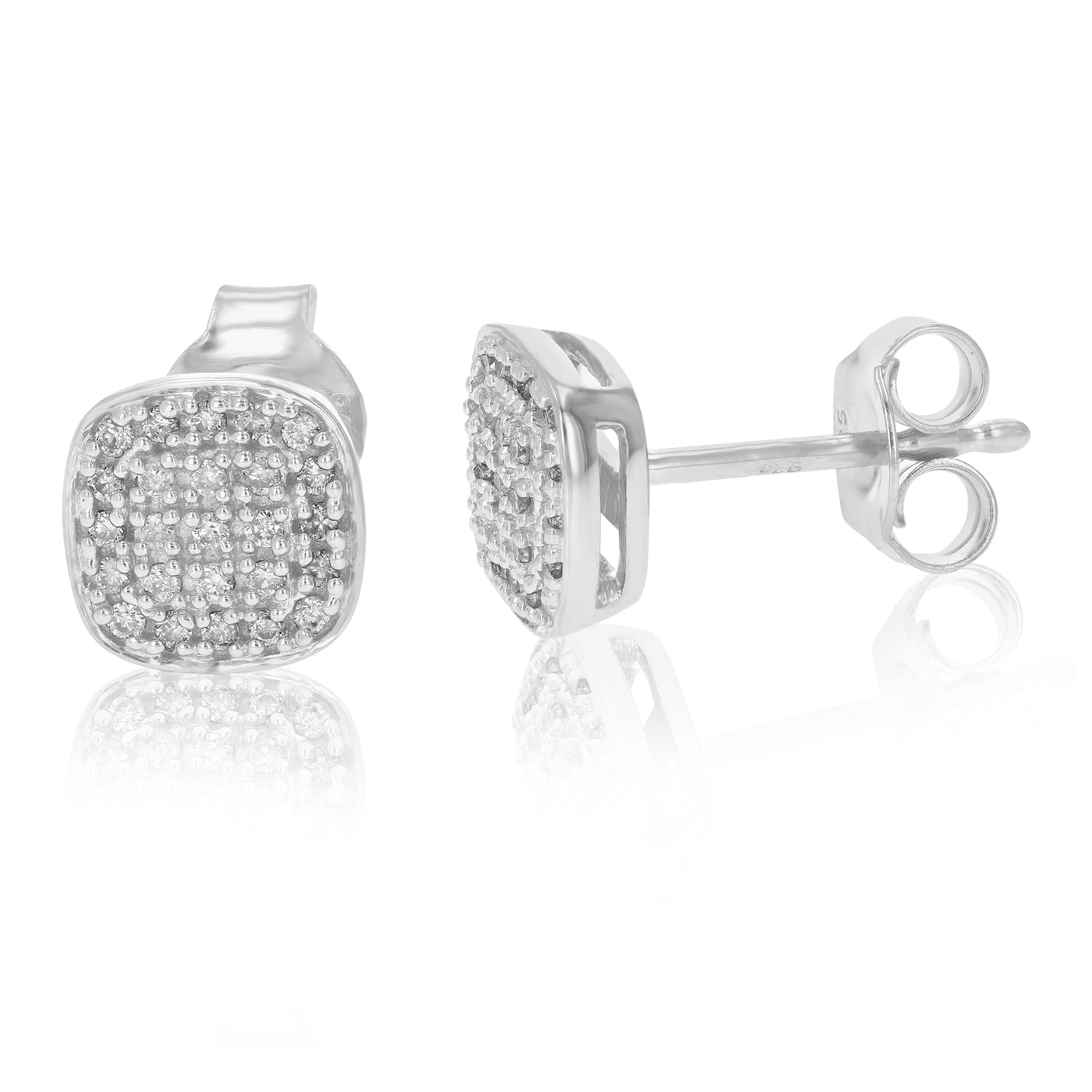 Crafted in .925 sterling silver with 50 round-cut lab-grown diamonds totaling 1/5 cttw. Prong-set for brilliance. Diamond color: H-I; clarity: SI1-SI2. Stud width: 7mm (1/4 inch), height: 7mm (1/4 inch). April birthstone.