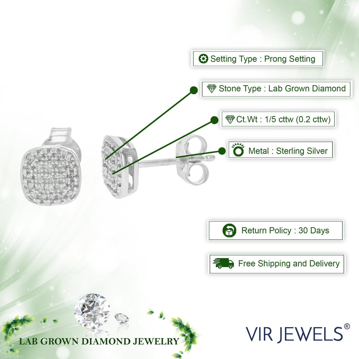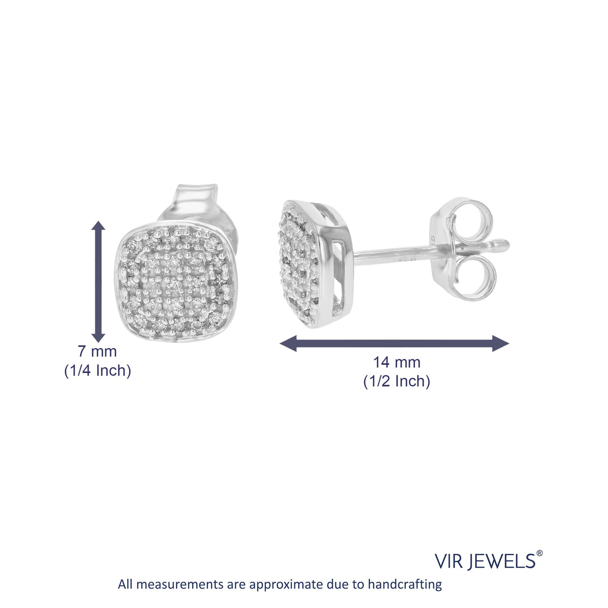 These 1/5 cttw Lab Grown Diamond Square Stud Earrings by Vir Jewels offer a modern take on classic diamond studs. With 50 meticulously set diamonds arranged in a prong setting, these square studs exude contemporary elegance. The sterling silver framework enhances their luminous appeal, making them a standout piece in any collection.