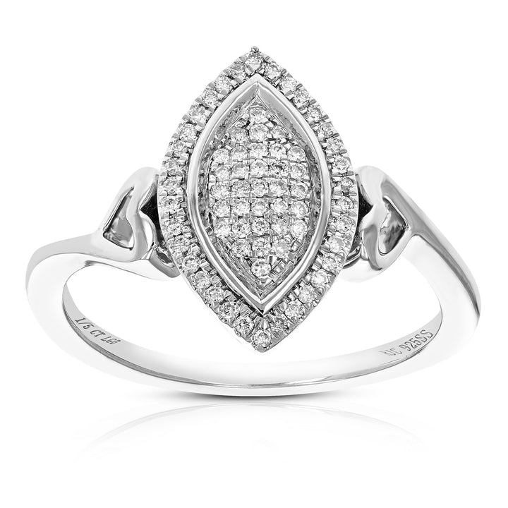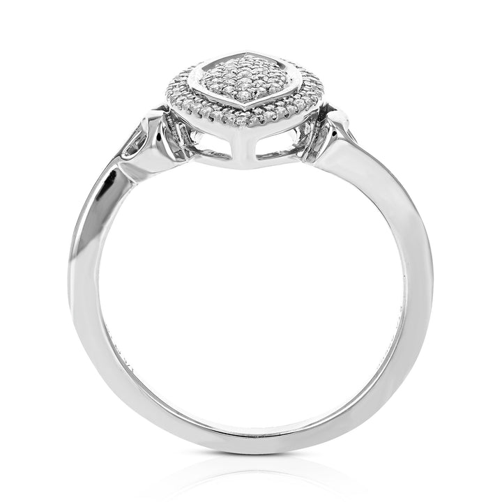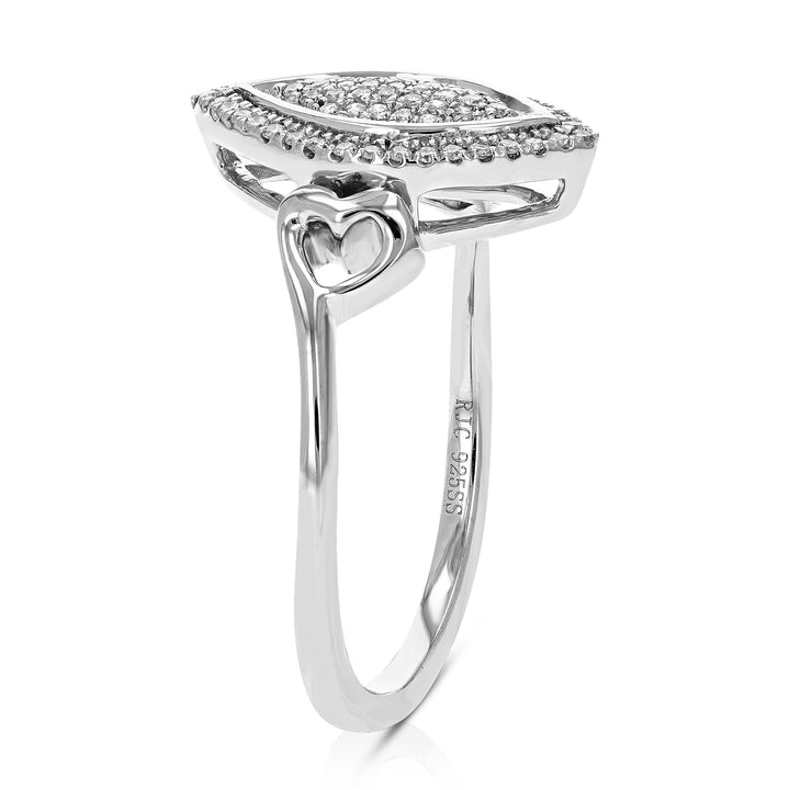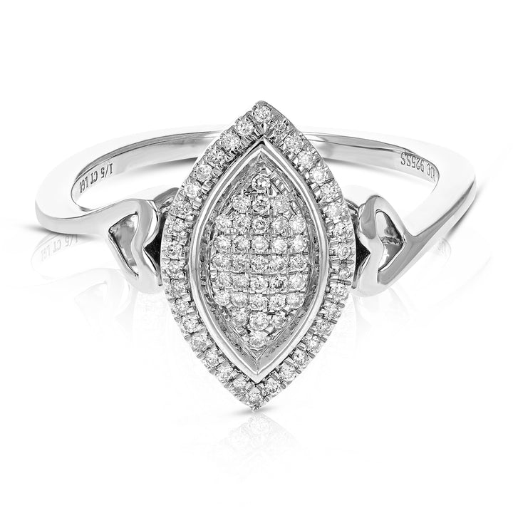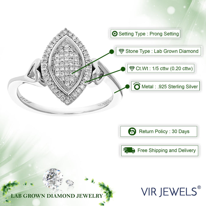 Crafted in .925 sterling silver with 1/5 cttw round-cut lab-grown diamonds. Diamonds are H-I color, SI1-SI2 clarity. Features a prong setting with 67 diamonds. Ring dimensions: Width: 15mm (2/3 inch), Length: 9mm (1/3 inch).