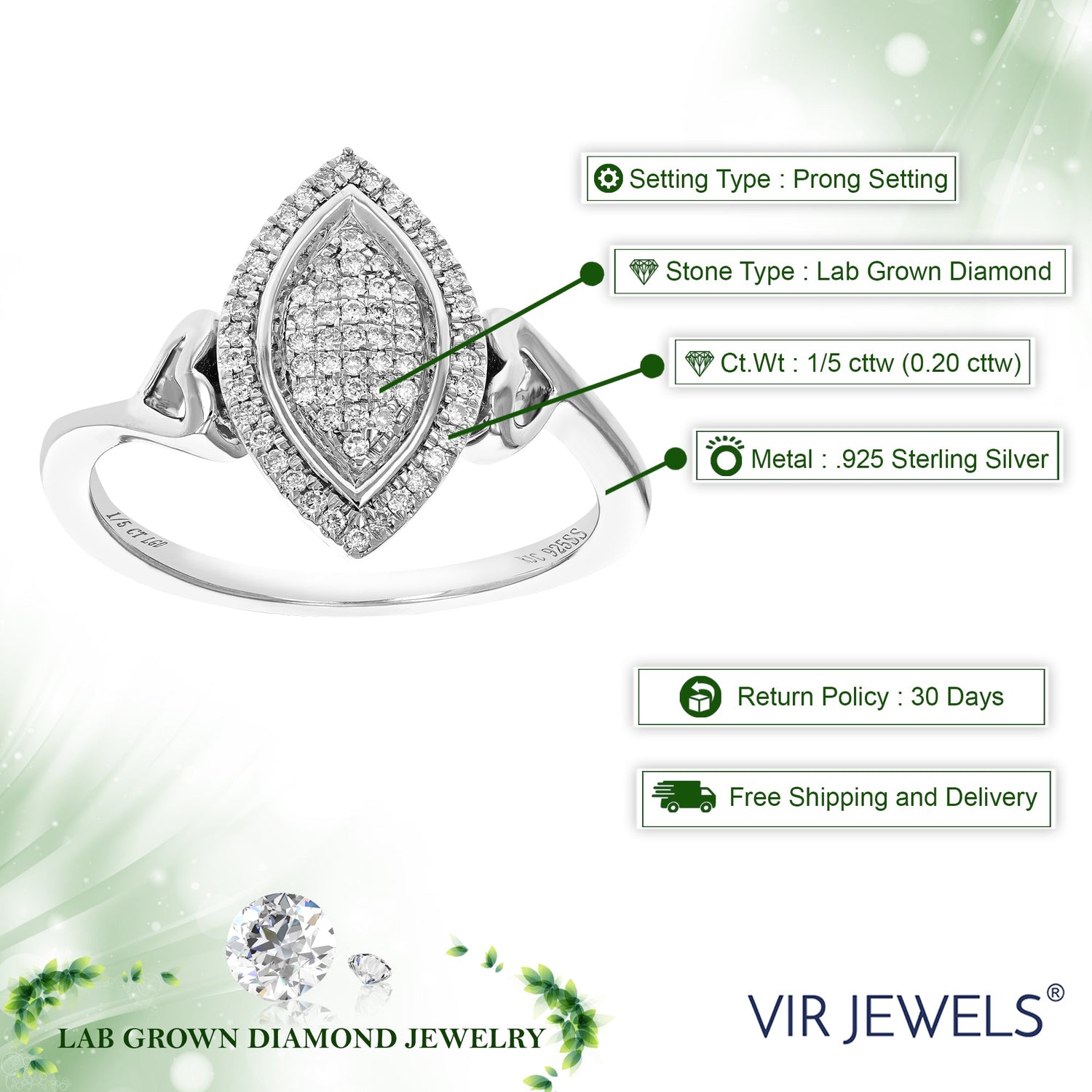 This 1/5 cttw Lab Grown Diamond Engagement Ring by Vir Jewels is designed for those who appreciate timeless beauty. Featuring 67 glistening diamonds set in a lustrous sterling silver band, this ring showcases a brilliant display of light and elegance. The secure prong setting enhances the brilliance of each stone, making it a striking symbol of love and commitment.
