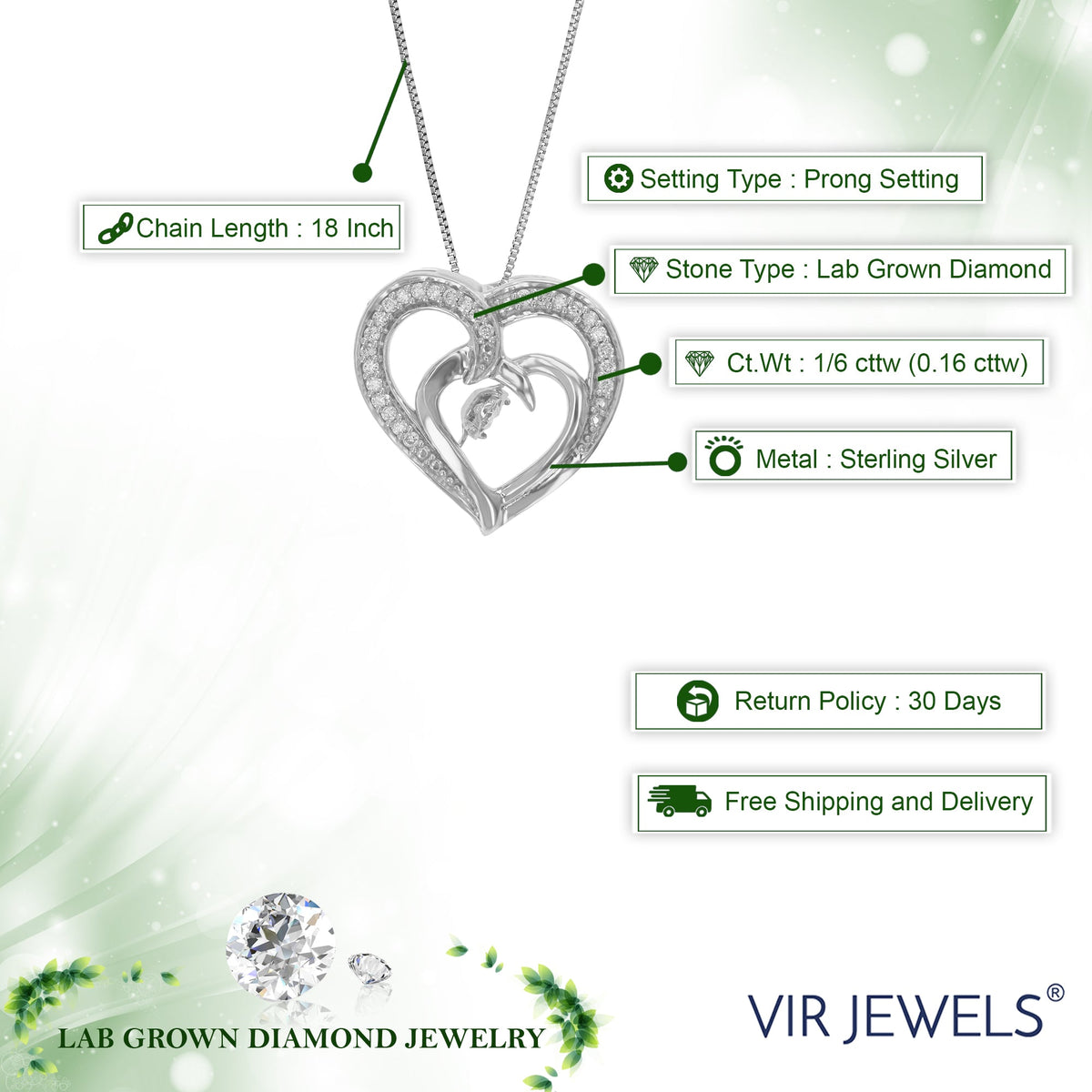 Crafted in .925 sterling silver with 1/6 cttw round-cut lab-grown diamonds. Diamonds are H-I color, SI1-SI2 clarity. Features a prong setting with 27 diamonds. Pendant dimensions: Width: 16mm (2/3 inch), Length: 16mm (2/3 inch). Chain length: 18 inches.