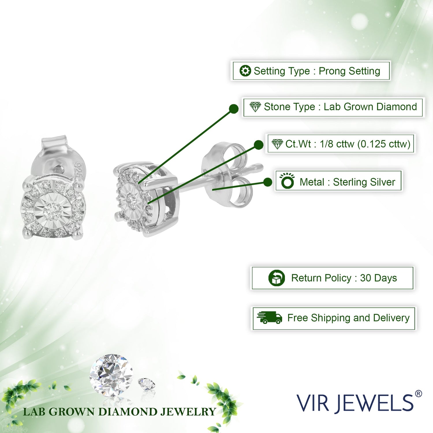 These 1/8 cttw Round Lab Grown Diamond Stud Earrings by Vir Jewels offer a classic yet contemporary design that enhances any look. Set in high-polish sterling silver, 26 dazzling diamonds are prong-set to maximize light reflection and brilliance. Lightweight and versatile, these studs are perfect for daily wear or as a special gift, delivering understated luxury with every wear.