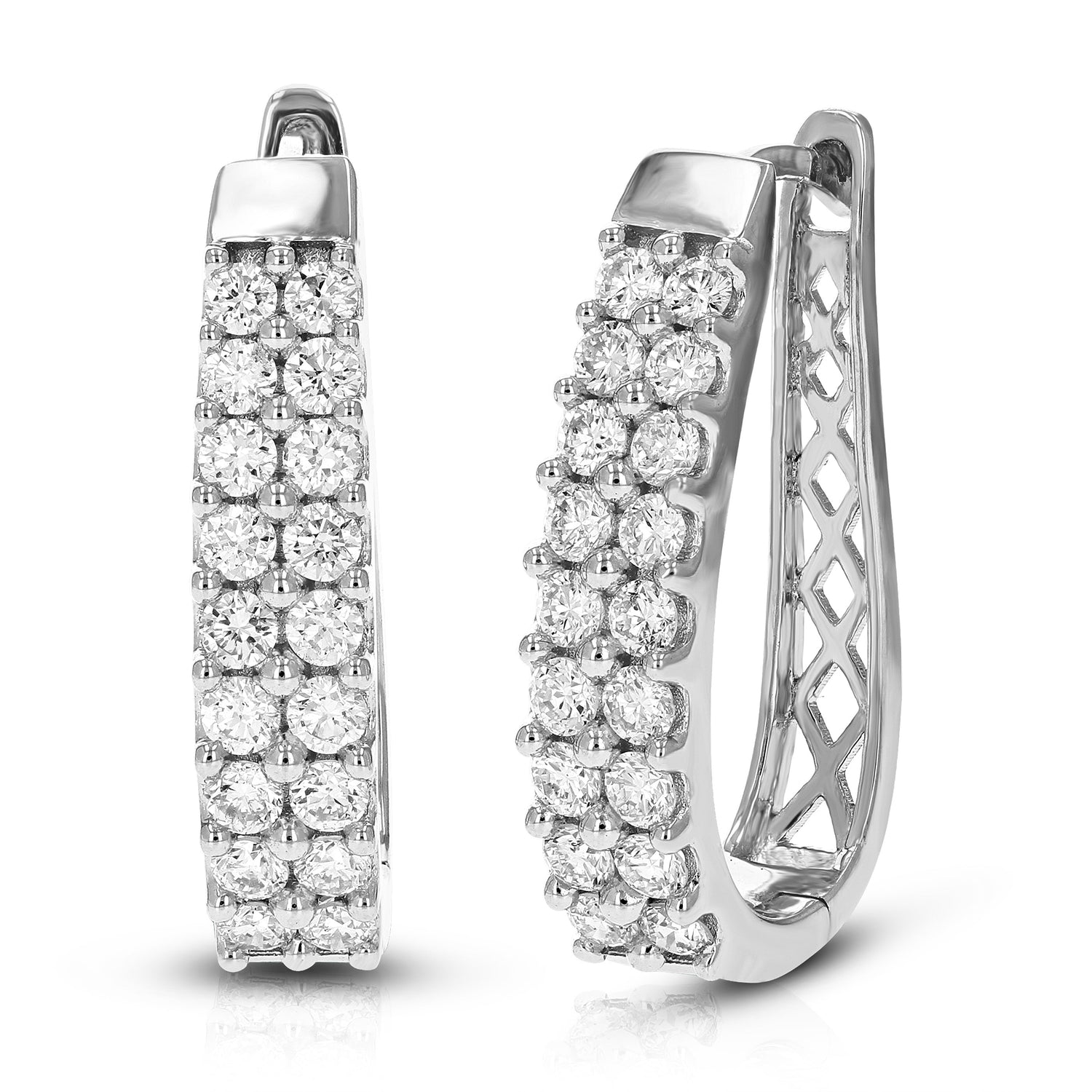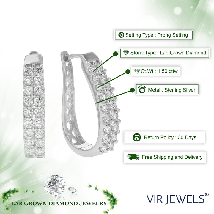 These 1.50 cttw Round Lab Grown Diamond Hoop Earrings by Vir Jewels feature 36 sparkling diamonds, each set in a durable .925 sterling silver hoop. The prong setting ensures the diamonds are visible and secure, highlighting their brilliance. These 1-inch hoop earrings are perfect for elevating any outfit, whether for casual wear or formal events. A chic and versatile addition to your jewelry collection, they also make an excellent gift for someone special.