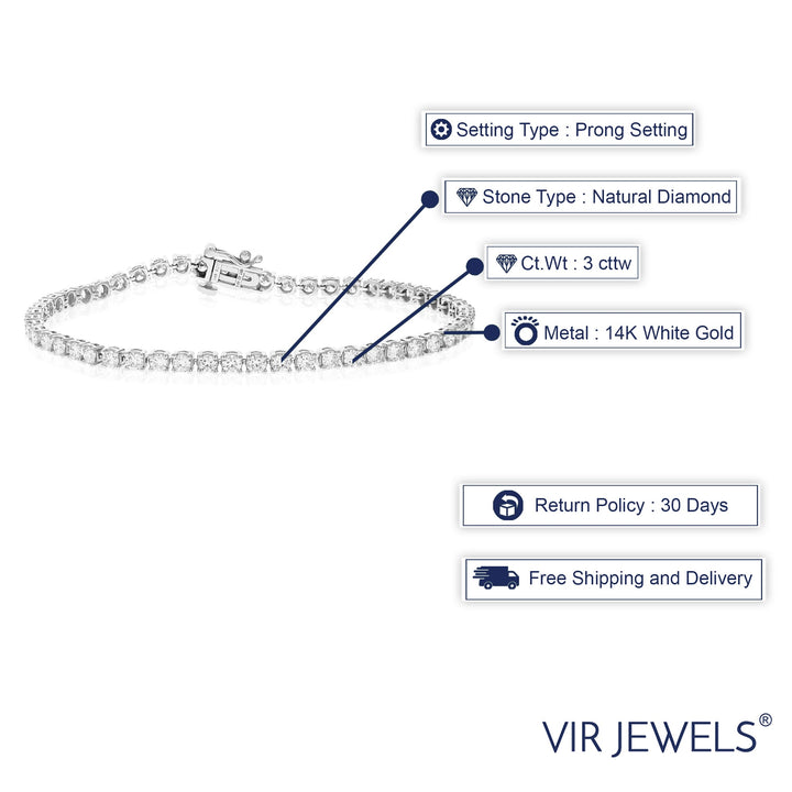 3 cttw 53 Stones Round Diamond Bracelet 14K White Gold Prong Set 7 Inch