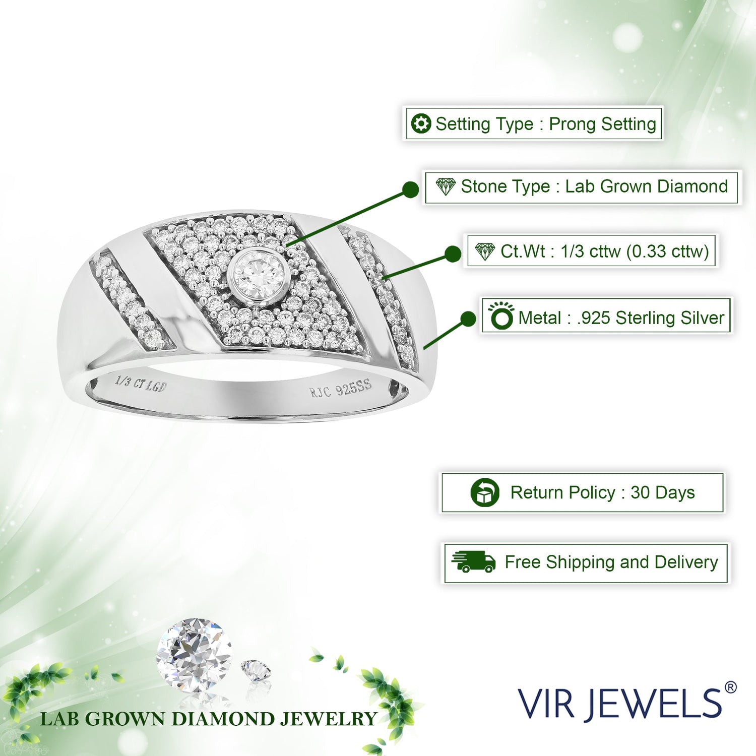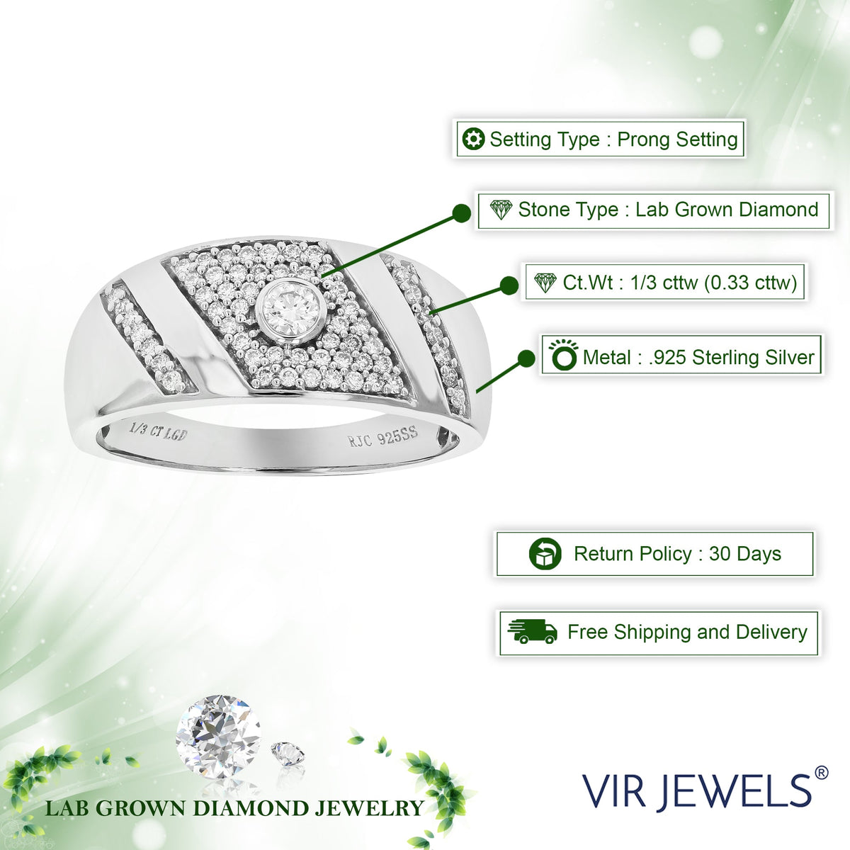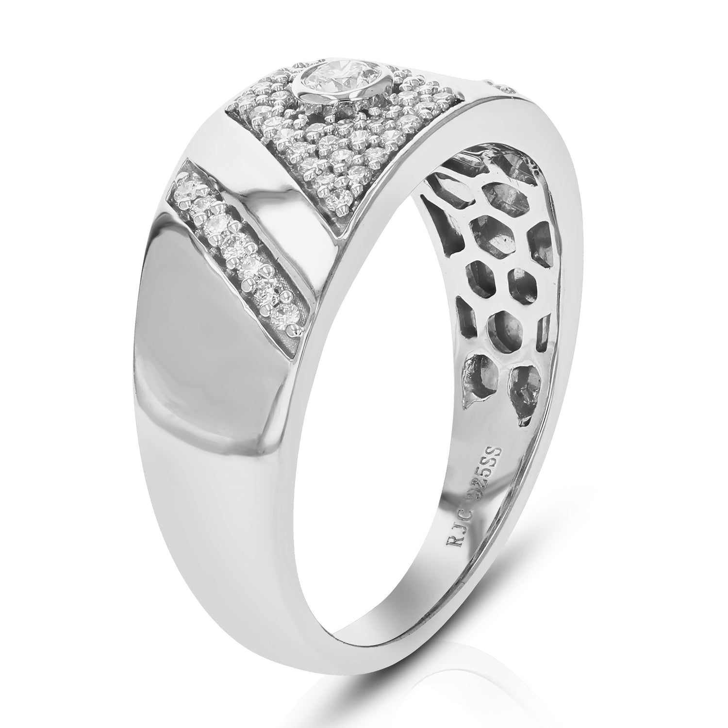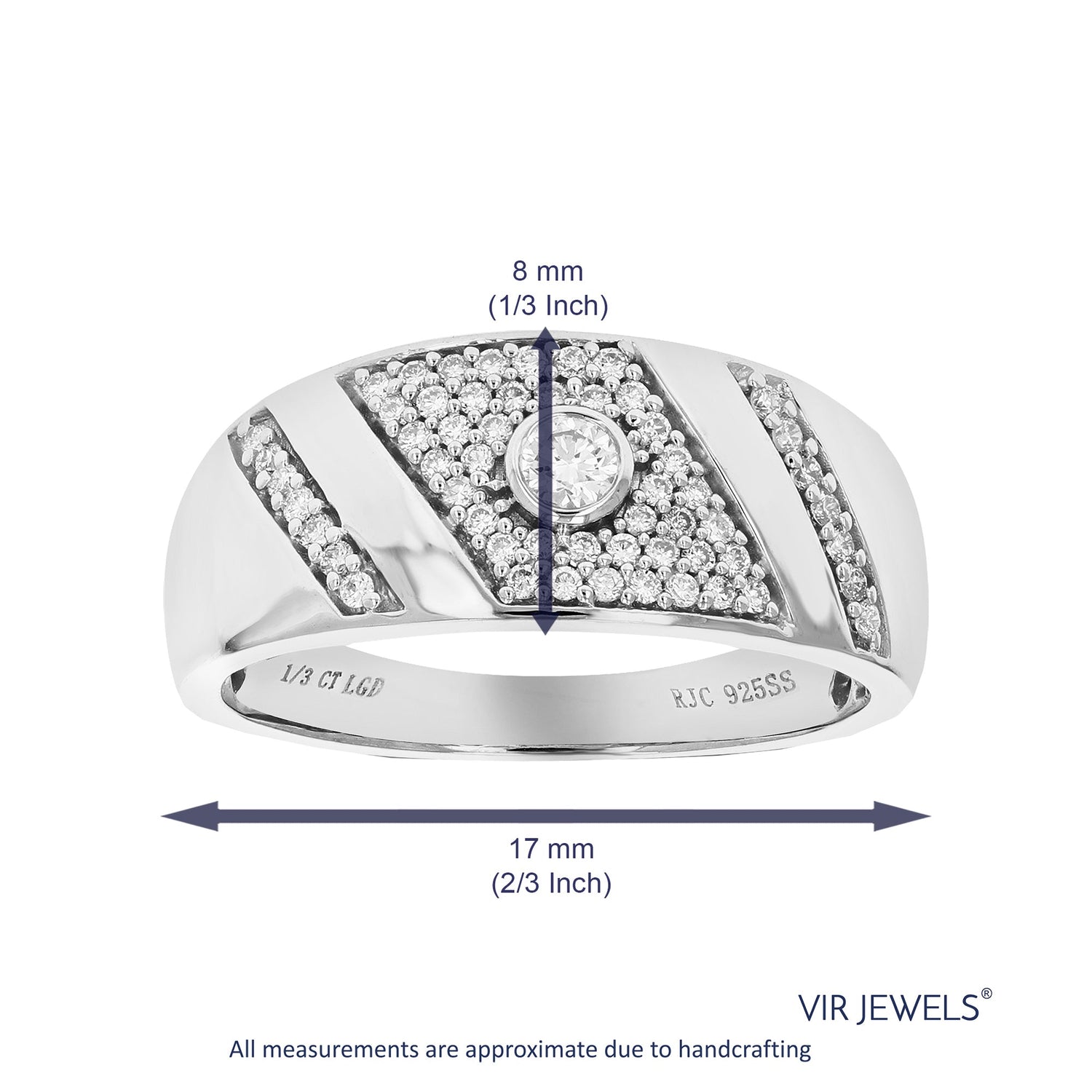 Handcrafted in .925 sterling silver with 1/3 cttw of round lab-grown diamonds (H-I color, SI1-SI2 clarity). Setting: Prong. Width: 8mm.