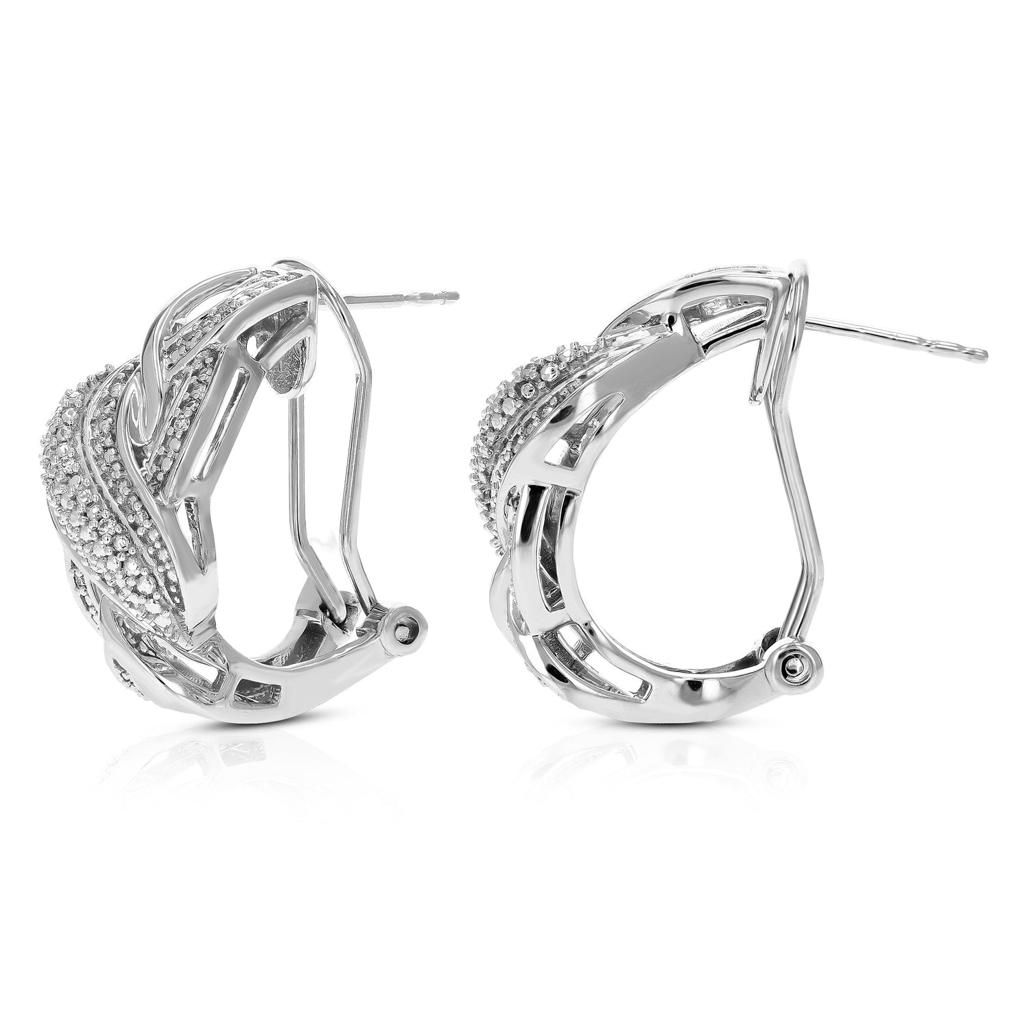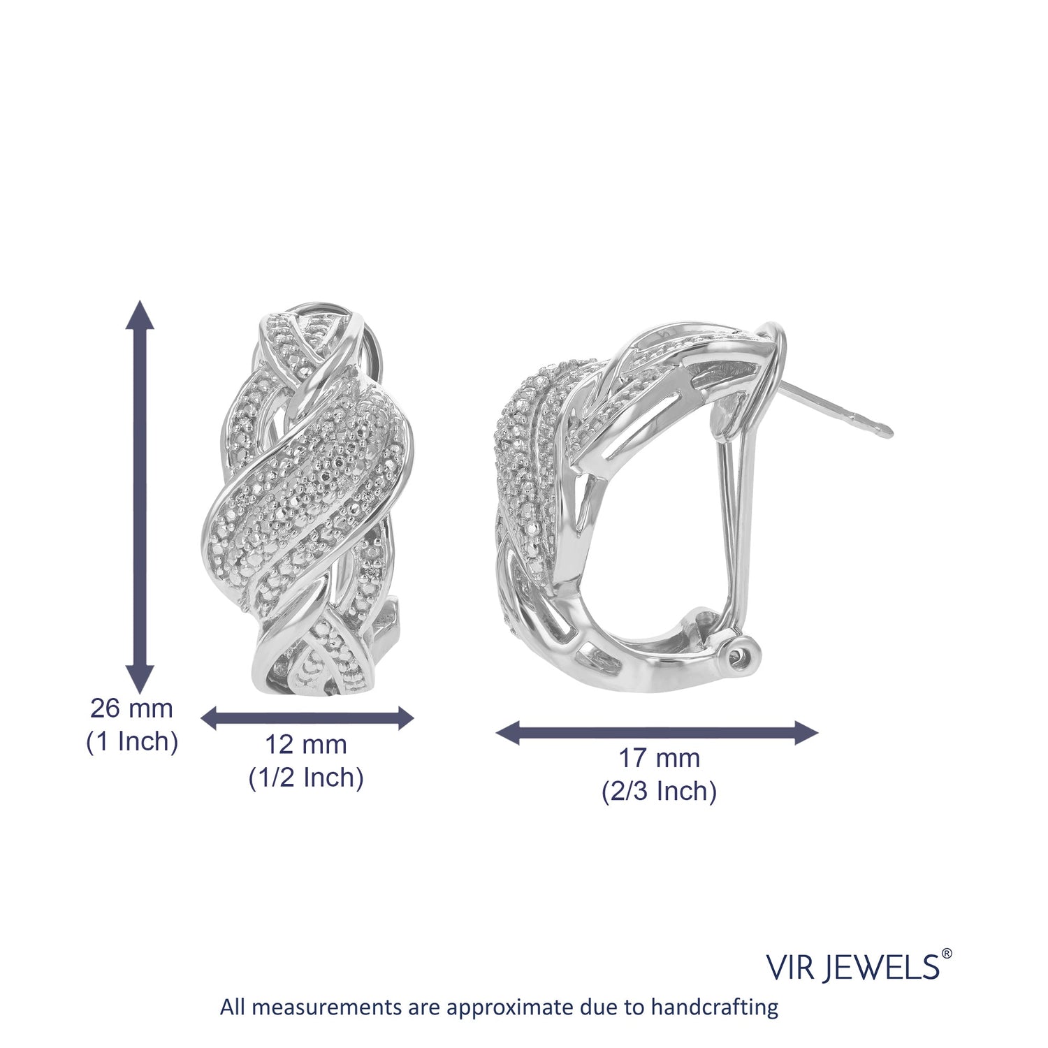 Handcrafted in .925 sterling silver with 24 round-cut lab-grown diamonds, totaling 1/10 cttw. Diamond color H-I, clarity SI1-SI2. Prong setting for secure and brilliant diamond display. Hoop width: 12mm (1/2 inch); height: 26mm (1 inch).