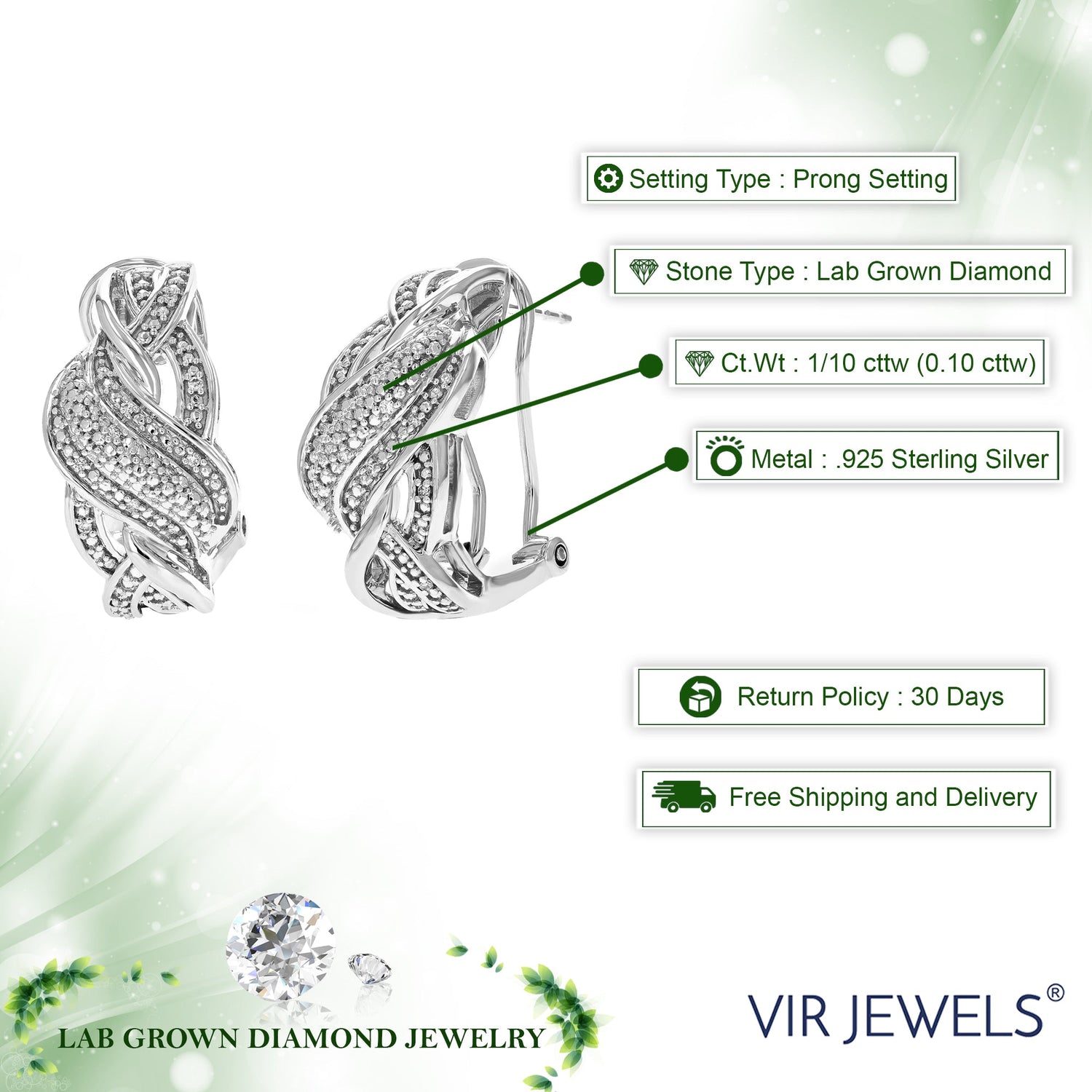 These 1/10 cttw Round Lab Grown Diamond Hoop Earrings by Vir Jewels feature 24 round-cut diamonds, each carefully set in a prong setting that maximizes their brilliance. The .925 sterling silver hoop earrings offer a polished finish that adds sophistication to any look. With a 1-inch hoop size, these earrings are versatile enough to pair with both casual and formal attire. Ideal for those who want a classic and chic look, these earrings make a perfect gift or an addition to your jewelry collection.