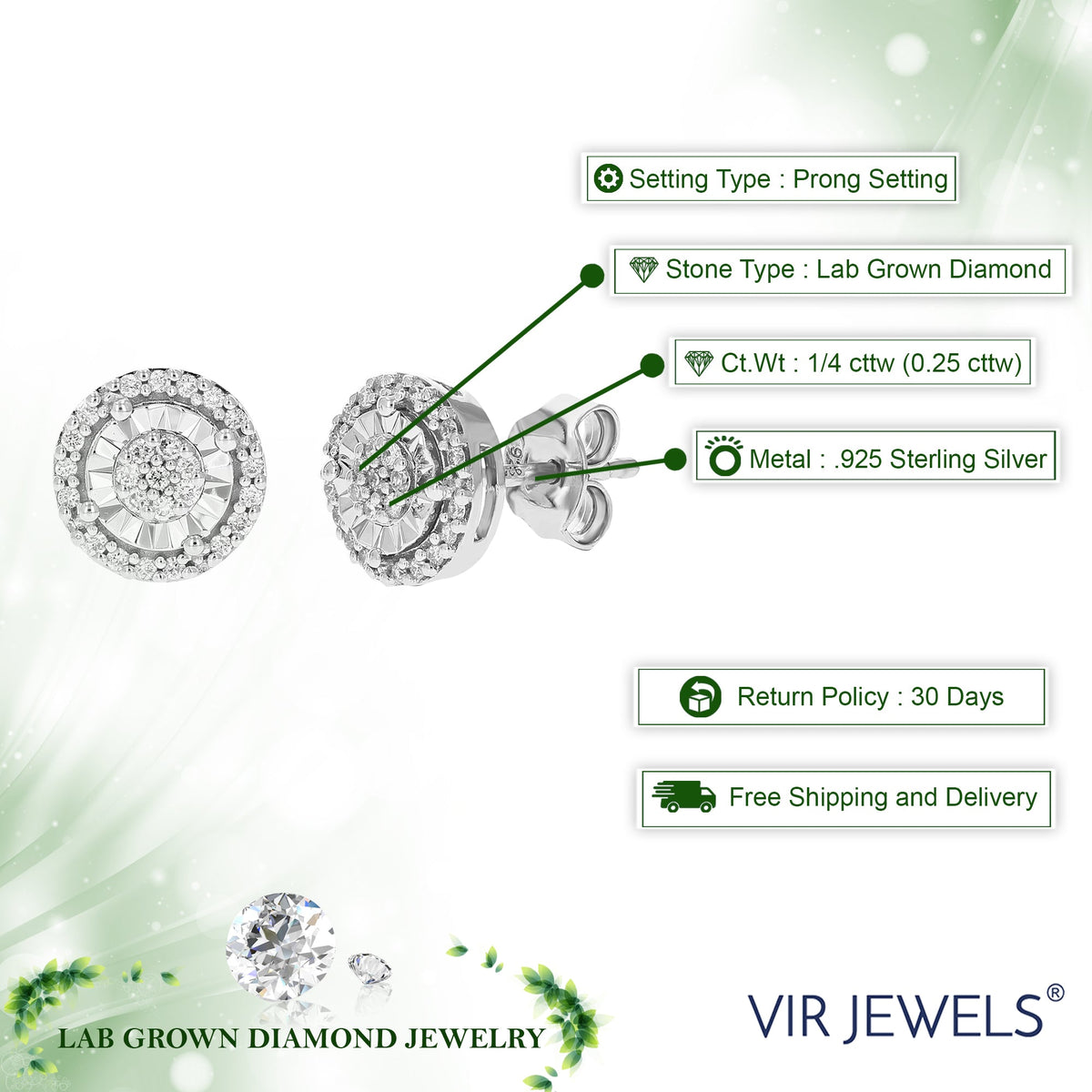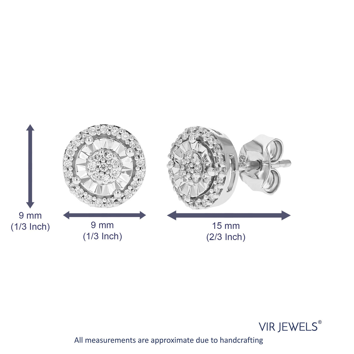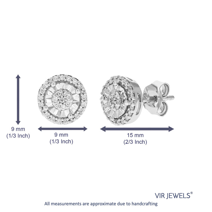 Crafted in .925 sterling silver with 1/4 cttw round-cut lab-grown diamonds. Diamonds are H-I color, SI1-SI2 clarity. Features a prong setting with 50 diamonds. Earring dimensions: Width: 9mm (1/3 inch), Height: 9mm (1/3 inch).