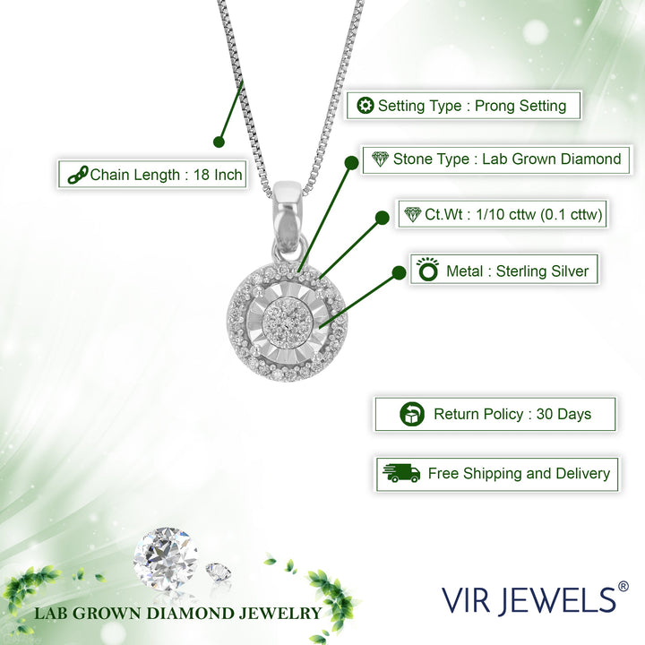 This 1/10 cttw Lab Grown Diamond Circle Pendant Necklace by Vir Jewels is a refined and timeless design. Featuring 32 round-cut diamonds mounted in a secure prong setting, this necklace creates a stunning balance between elegance and sparkle. Ideal for layering or wearing alone, this piece is perfect for elevating your everyday style or gifting to someone special.