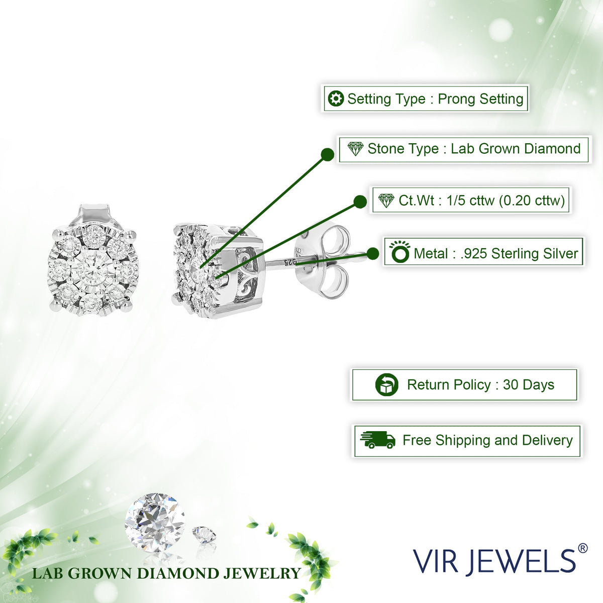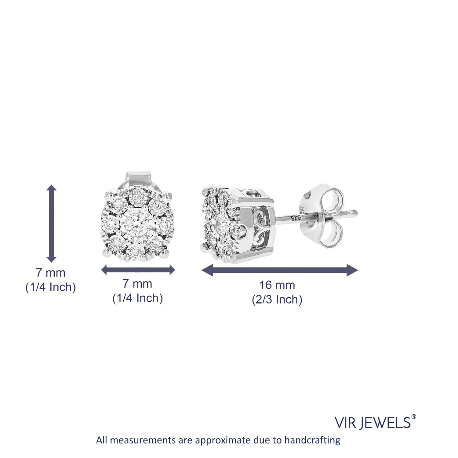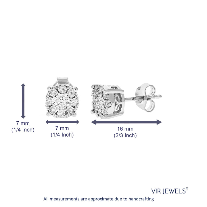 Crafted in .925 sterling silver with 1/5 cttw round-cut lab-grown diamonds. Diamonds are H-I color, SI1-SI2 clarity. Features a prong setting with 18 diamonds. Earring dimensions: Width: 7mm (1/4 inch), Height: 7mm (1/4 inch).