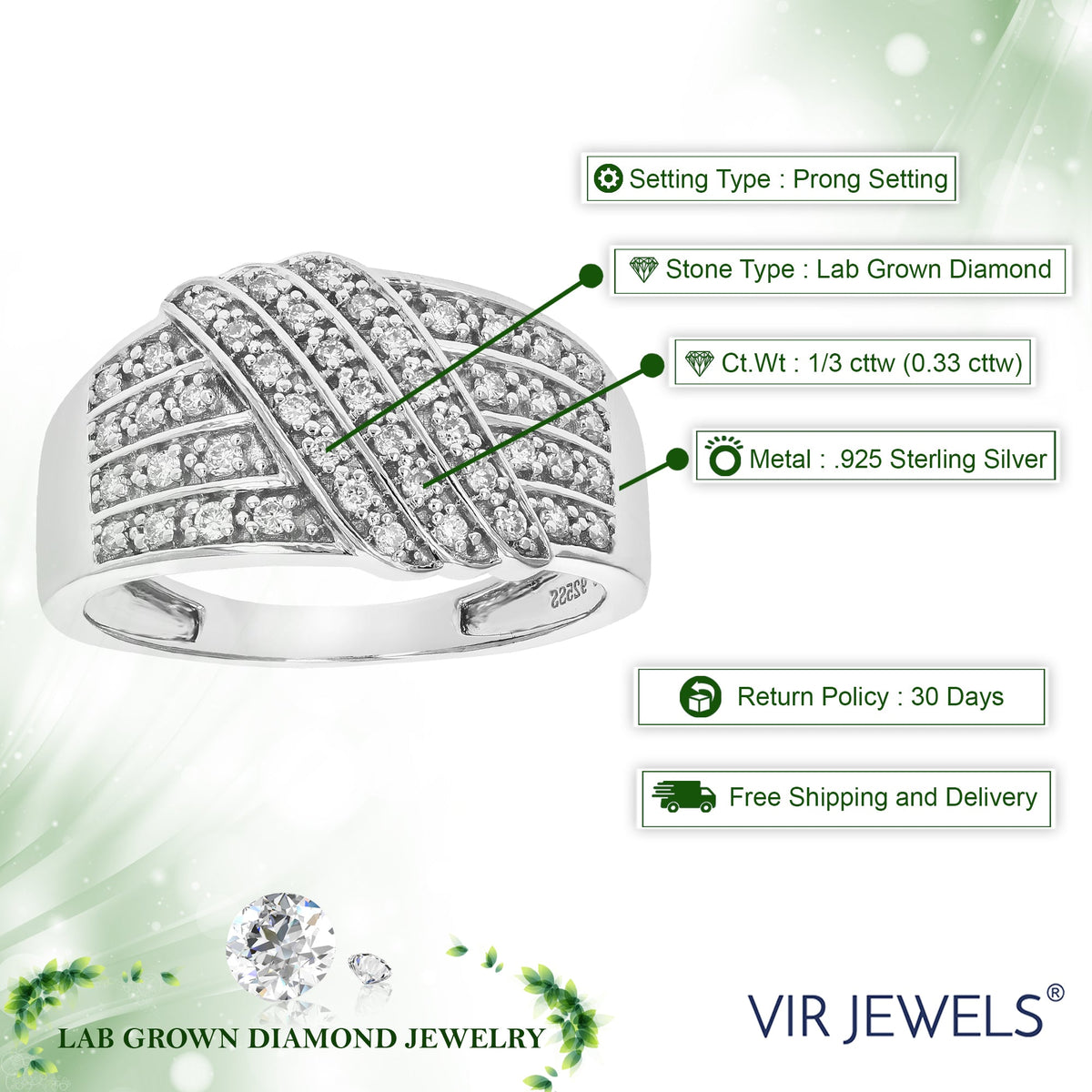 Handcrafted in .925 sterling silver, with 1/3 cttw of round lab-grown diamonds (H-I color, SI1-SI2 clarity). Setting: Prong. Width: 11mm.