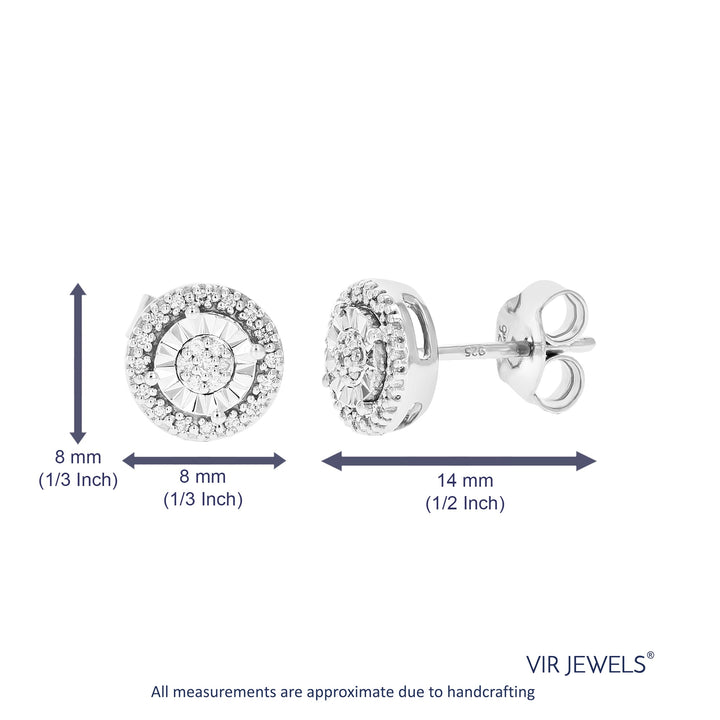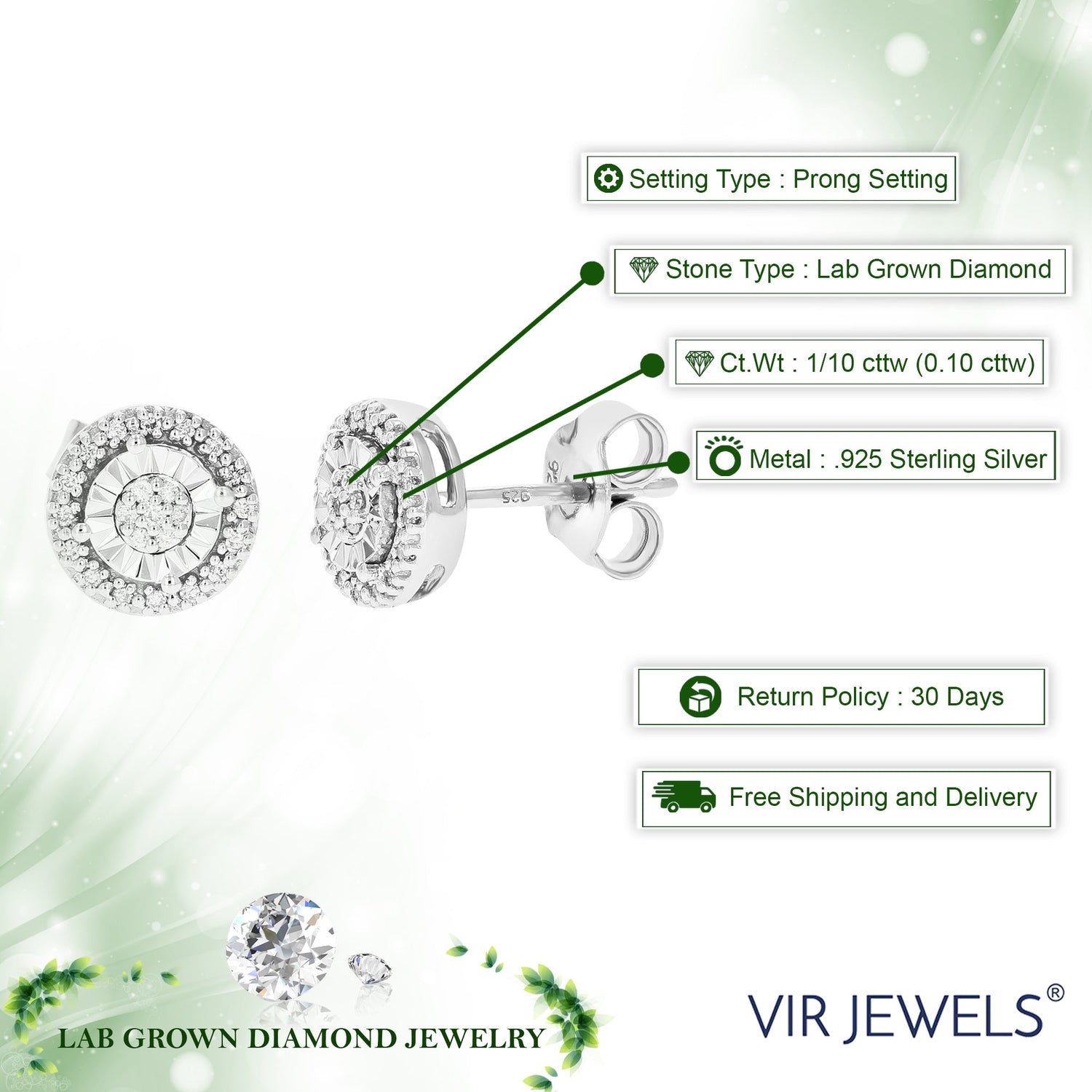 These 1/10 cttw Round Lab Grown Diamond Stud Earrings by Vir Jewels feature a radiant cluster of 46 diamonds, arranged in a striking prong-set design. The shimmering sterling silver enhances the brilliance of each stone, offering a luminous look that is both sophisticated and contemporary. Ideal for adding a subtle sparkle to any outfit.