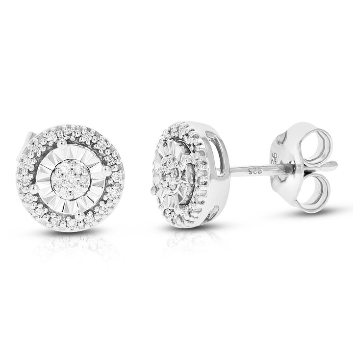Crafted in .925 sterling silver with 1/10 cttw round-cut lab-grown diamonds. Diamonds are H-I color, SI1-SI2 clarity. Features a prong setting with 46 diamonds. Earring dimensions: Width: 8mm (1/3 inch), Height: 8mm (1/3 inch).