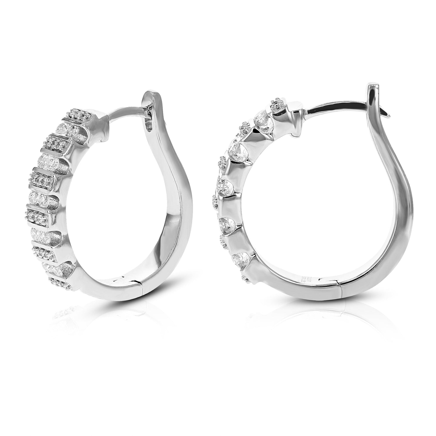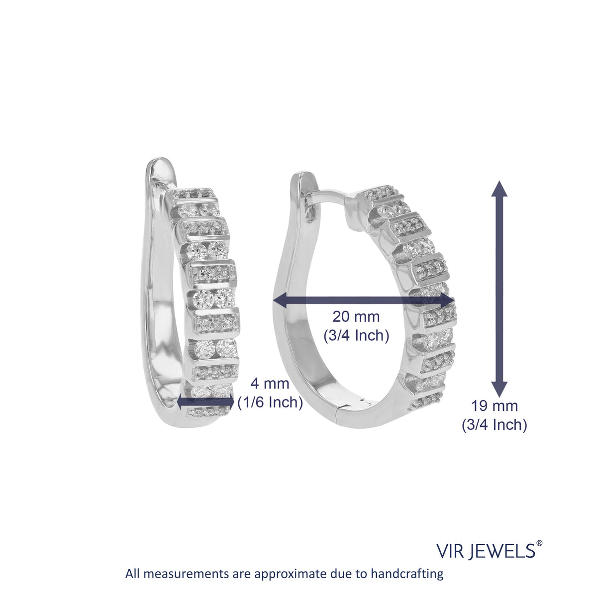 Handcrafted in .925 sterling silver with 56 round lab-grown diamonds (1/2 cttw). Diamond clarity: SI1-SI2, color: H-I. Prong setting. Hoop earrings width: 4 MM (1/6 Inch); Height: 21 MM (3/4 Inch).