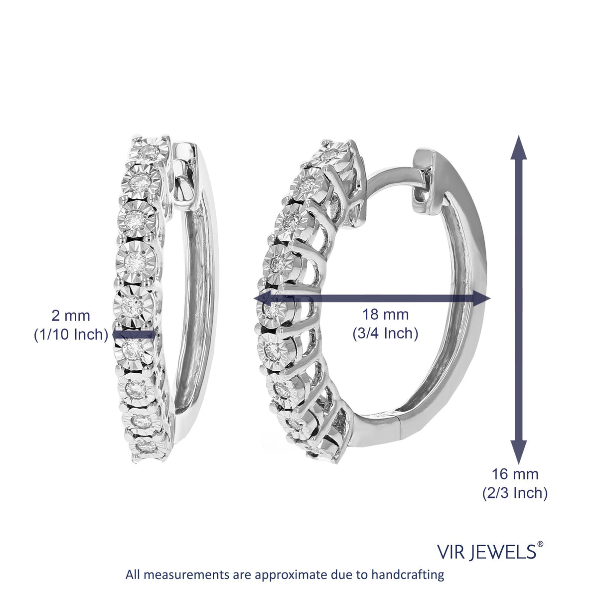 Set in .925 sterling silver with 18 round lab-grown diamonds totaling 1/8 cttw. Diamonds are H-I color, SI1-SI2 clarity. Prong setting for secure placement. Hoop dimensions: 2.5mm (1/10 inch) in width, 14mm (1/2 inch) in height.