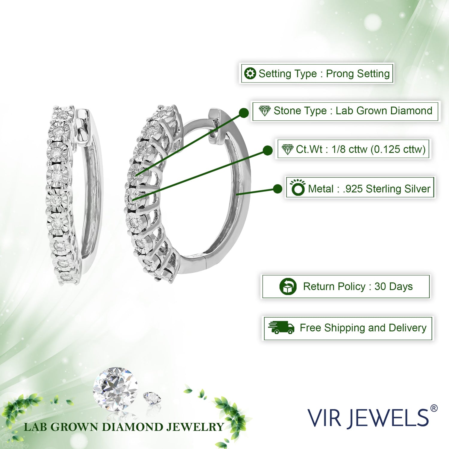 These Round Lab Grown Diamond Hoop Earrings by Vir Jewels offer a chic and timeless design with 18 sparkling diamonds adorning their sleek sterling silver frame. The delicate prong setting enhances the brilliance of each diamond while providing secure placement. Their lightweight feel and classic elegance make them a versatile accessory for both everyday wear and formal occasions.