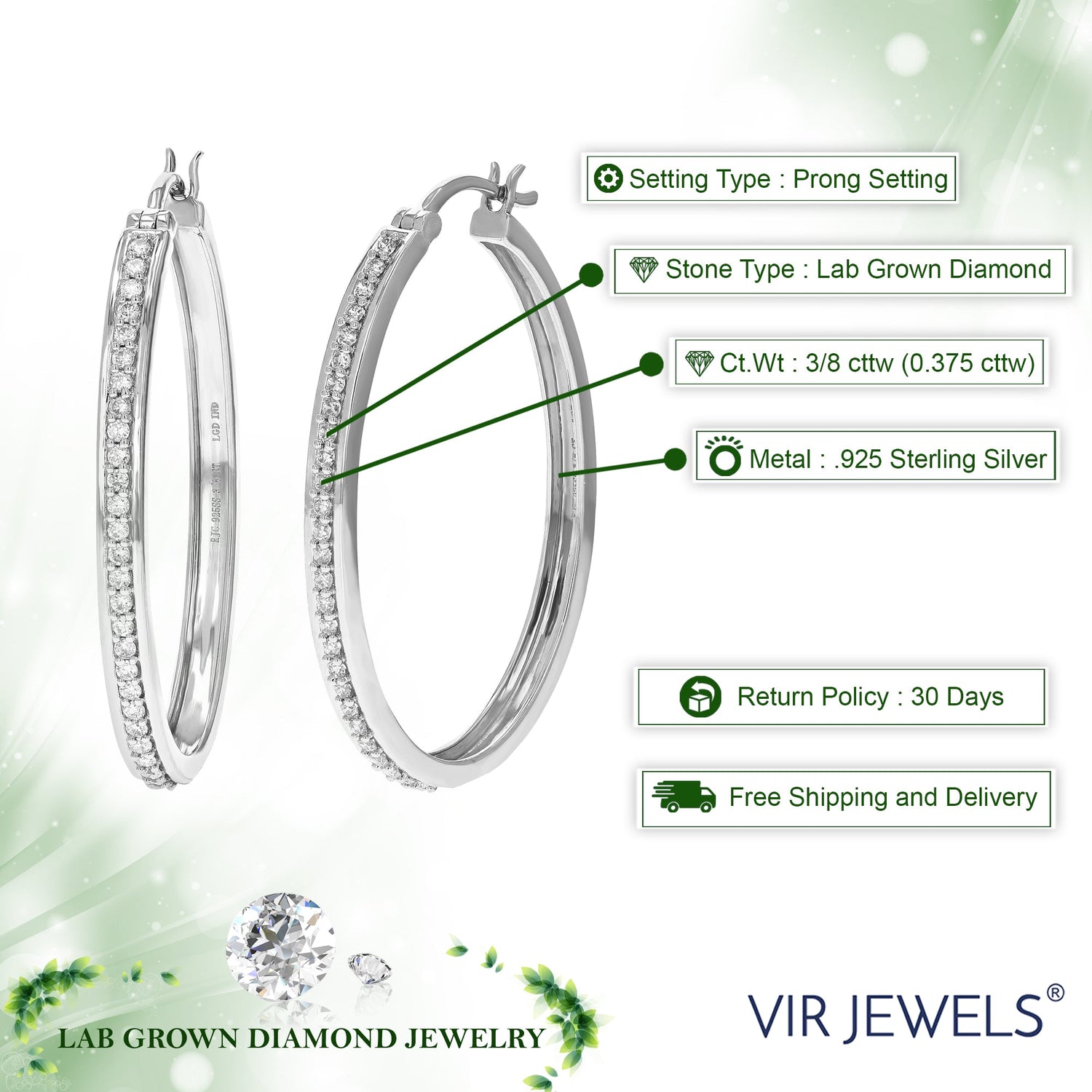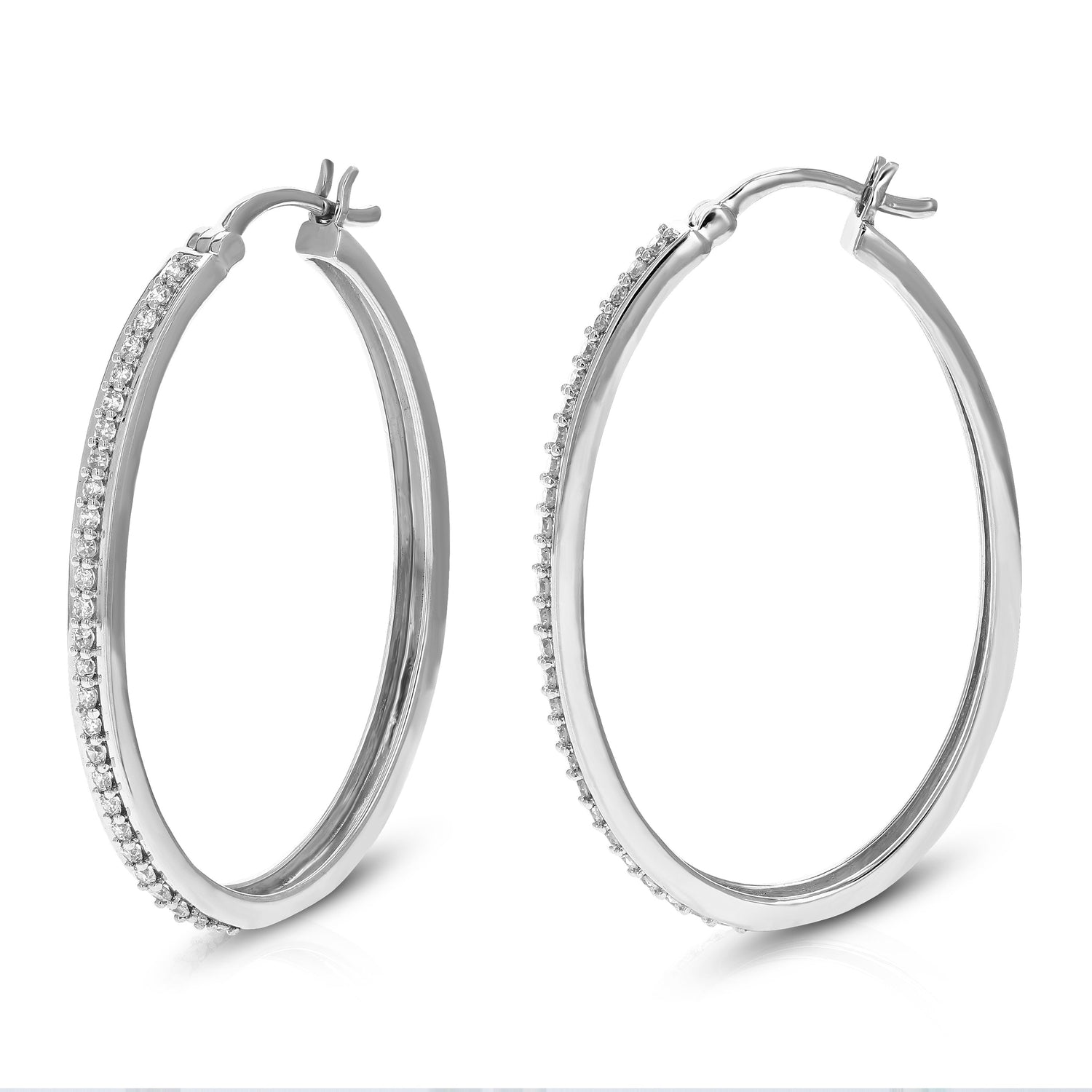 Crafted in .925 sterling silver with 54 round lab-grown diamonds totaling 3/8 cttw. Diamonds are H-I color, SI1-SI2 clarity. Prong setting for secure placement. Hoop dimensions: 3mm (1/10 inch) in width, 30mm (1 1/4 inch) in height.